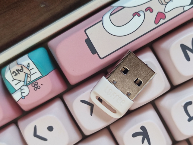 Lofree洛斐小翘机械键盘小小的接收器不想放在电池仓里还可以用绳子悬挂起来,上面刻有Lofree字样,细节满满。