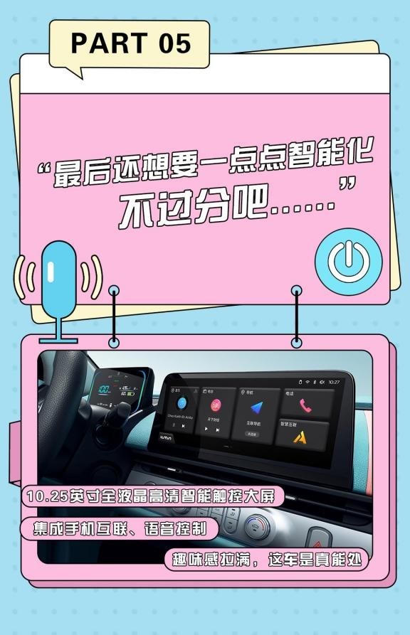 在万物皆智能的时代,新手司机也期待车子的智能化,实现人车互动,在享受便捷之余,共度一段快乐有趣的出行时光。长安Lumin满足他们的需求,10.25英寸全液晶高清智能触控大屏,集手机互联、语音控制等多功能于一体,畅享便捷和趣味,氛围感瞬间拉满。
