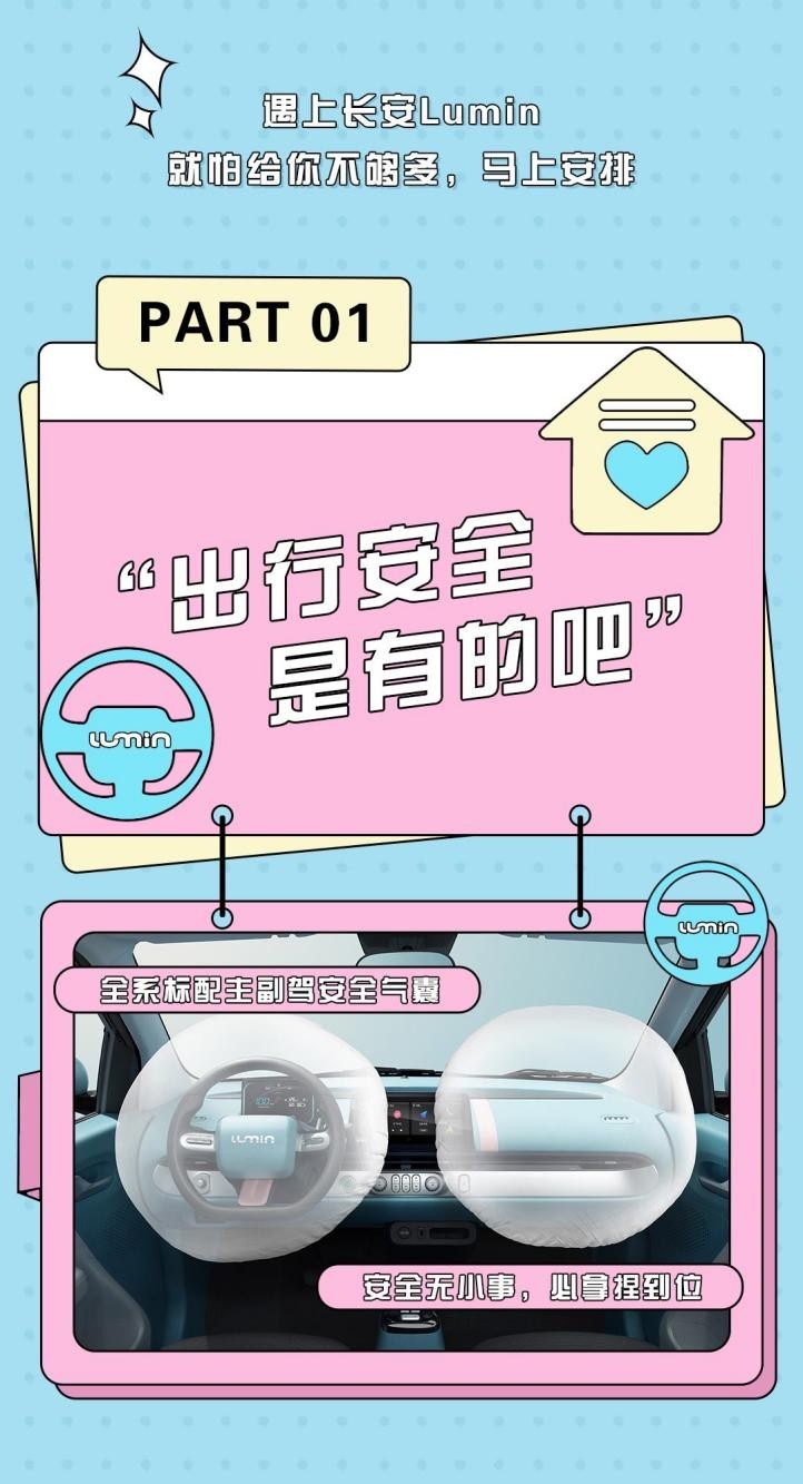 所谓道路千万条,安全第一条。对每一个出行的人而言,安全是重中之重,除了自身的安全防护外,车子的一些安全配置同样相当重要。作为国民出行精品车,长安Lumin的安全配置毫不含糊,全系标配主副驾安全气囊,让每一次快乐出行,安全感满满。