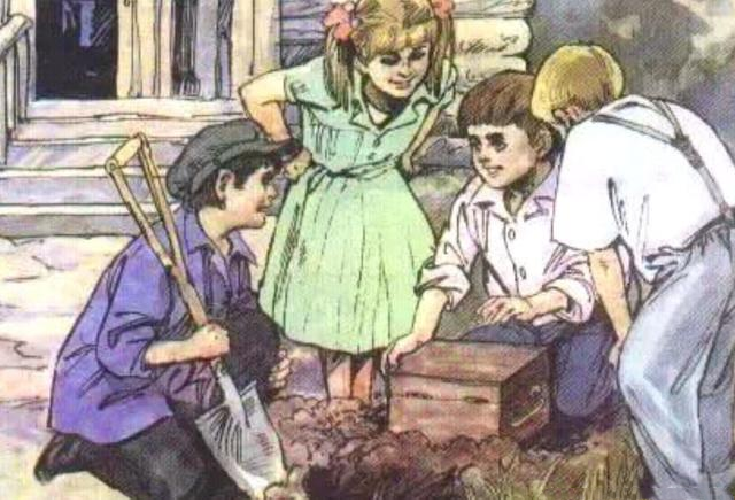 图十二是课文《科利亚的木匣》的插图。图中我们看到一群孩子在地下挖出了一个木匣子,他们都很开心。不过他们更多的是感叹,因为这个木盒子是小男孩5岁的时候,从门前走了10步后才埋下去了。