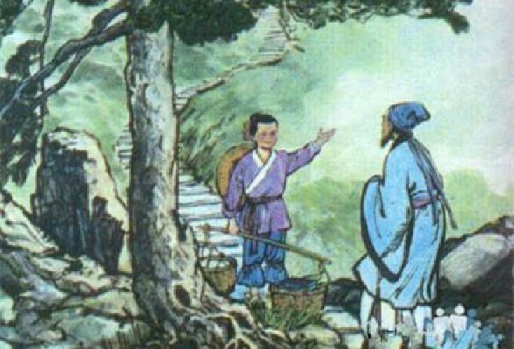 图一是一首古诗的插图,我们看一棵大松树下站着一个童子和问路人,熟悉古诗的朋友肯定会想到《寻隐者不遇》。没错,确实是这首诗的插图。