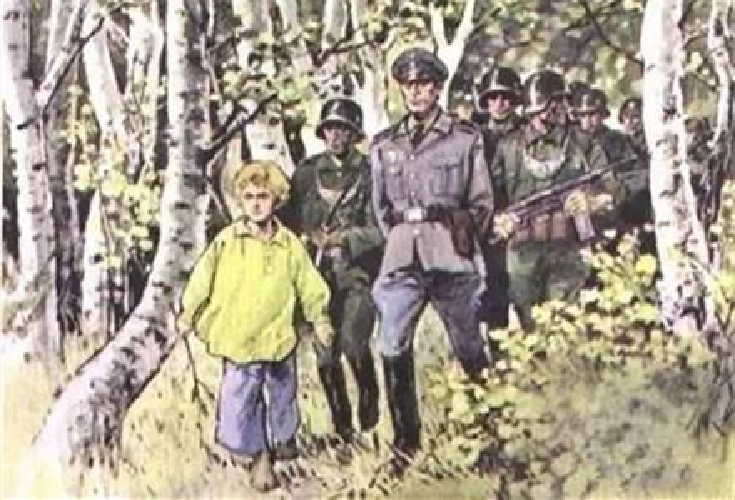 图十三是课文《夜莺的歌声》的插图,图中一个孩子和一群军人同行。其实这孩童是游击队员的孩子,名字叫夜莺。跟在他身后的是德国的敌人,他通过自己的智慧巧妙地同敌人周旋。