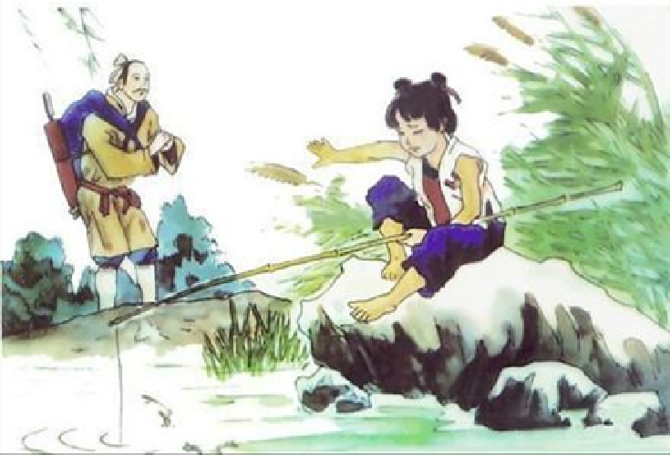 图五就比较经典了,是故事《小儿垂钓》的插图。这幅画是典型的中国水墨画风格,将两个人物的神韵完美地表达了出来。尤其是孩童害怕吓跑鱼儿的紧张的心情,让看图的人都不忍出声。