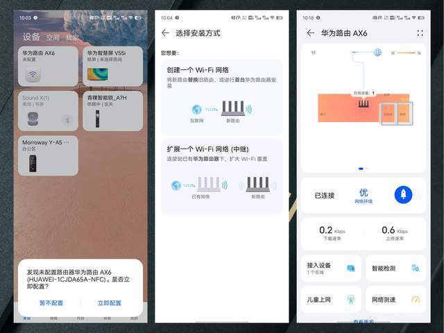 前文我们有提到,华为路由器AX6的正面有着NFC标志,支持手机一碰连网,这正是华为鸿蒙生态的一部分。鸿蒙系统手机或者安卓手机在开启NFC功能的情况下,碰一碰AX6的NFC区域,就可以免密连接Wi-Fi网络,如果有朋友来家里,这是更加方便的选择,减少了不必要的麻烦。同时,这个NFC区域还支持再碰弹出快捷菜单,可以轻松使用智能检测和儿童上网关怀等功能,总体还是比较方便的。