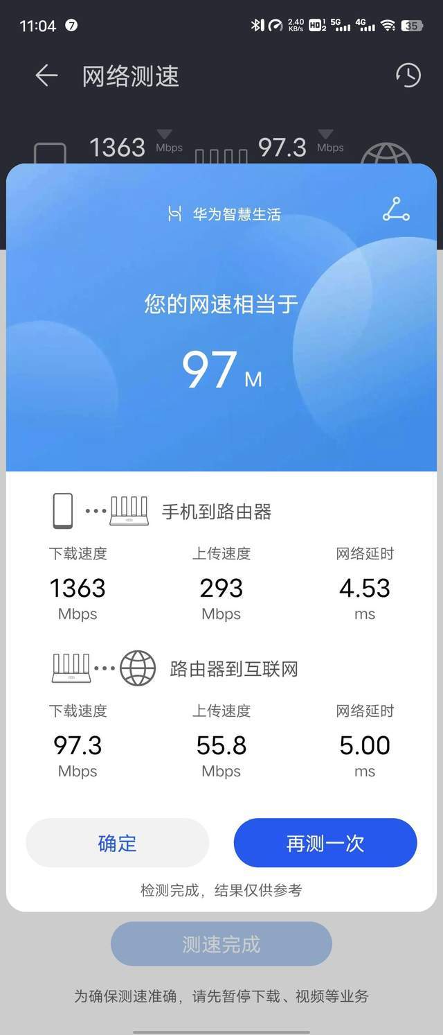 另外值得一提的是,华为路由器AX6自研的AI抗干扰技术的确非常实用,我们在测试中,虽然室内有不少其他设备的干扰,但是网络连接始终都相当稳定,没有出现剧烈的网络波动,也没有丢包等网络问题发声。
