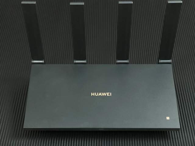 华为路由器AX6显然延续了华为的商务风,采用路由器常见的造型,有着四根外置天线和硬朗的线条,搭配上耐脏的黑色,放在各种装修环境下都是相当不错的。同时,华为路由器AX6的正面正中间有着黑金色的华为logo,右下角有NFC标志,代表着它支持华为的一碰传功能,具体的体验后续我们会讲到。
