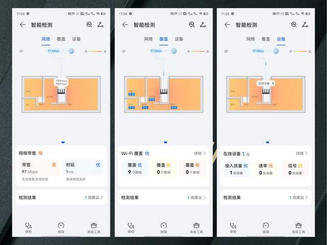 而让我比较惊喜的是,除了常规的上网设置和设备控制之外,还加入了覆盖可视化和故障可视化的功能,我们可以在”智慧生活“APP中编辑一个与自己家面积、户型相近户型图,设置好路由器摆放的位置。然后我们就可以清晰的了解到家庭WiFi覆盖热力图,直观了解到家里哪些位置网络覆盖不到位,或者是网络有故障,可以说是非常的方便。