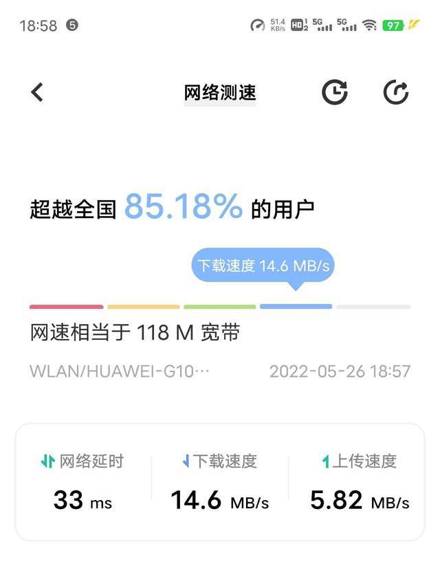 在足够给力的网速基础上,我们使用支持WiFi6的安卓手机进行了穿墙测试。距离路由所在房间有三面墙的基础上,手机接受到的网速依旧保持在118Mbps,实际衰减不算太多。在日常生活中,华为路由器AX6完全可以覆盖绝大部分人的屋内,保证在所有位置都有稳定的网络信号,可以让我们手机使用足够舒心,也可以让智能家居持续在线。