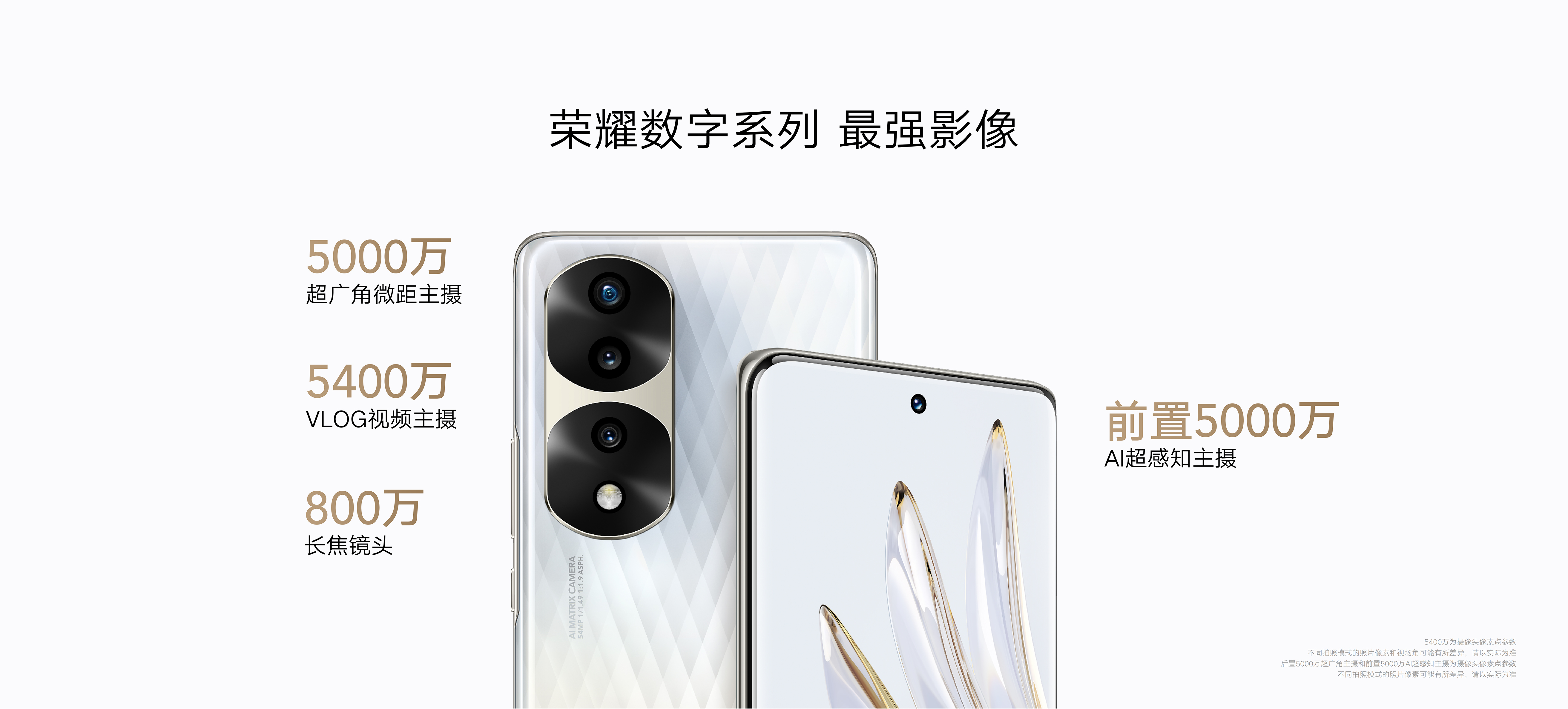 而至于前置摄像头区别则比较大,荣耀70 Pro/荣耀70 Pro +为5000万像素AI超感知前摄;荣耀70则是3200万像素的AI超感知前摄。