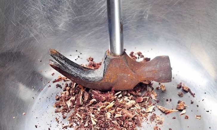 经过这番操作之后,骨头就会变得非常脆,且很容易晒干,就可以用锤子将它们碾碎成粉末,当然也有一些骨渣,有少量的骨粉并不会影响使用。