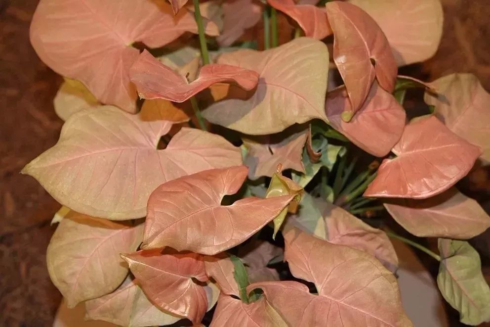 合果芋是非常耐阴的一种观叶植物,它的叶片平常都是银白色和绿色相间的,也有一些叶片呈粉色的品种。