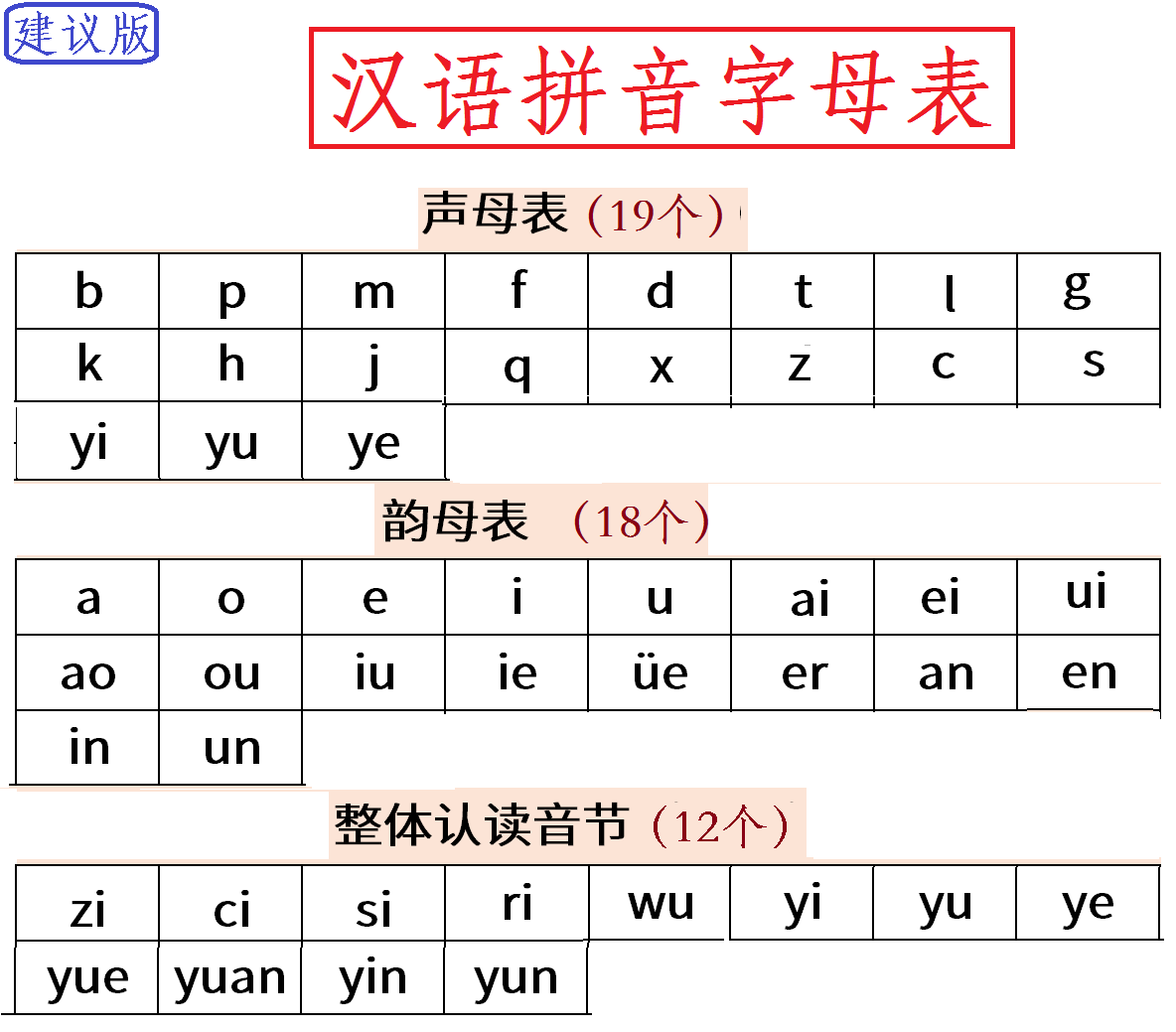 根据上述建议《汉语拼音方案》简化为:声母19个、韵母18个、整体认读音节12个,总49个。见下面《汉语拼音方案》(建议版)图片。