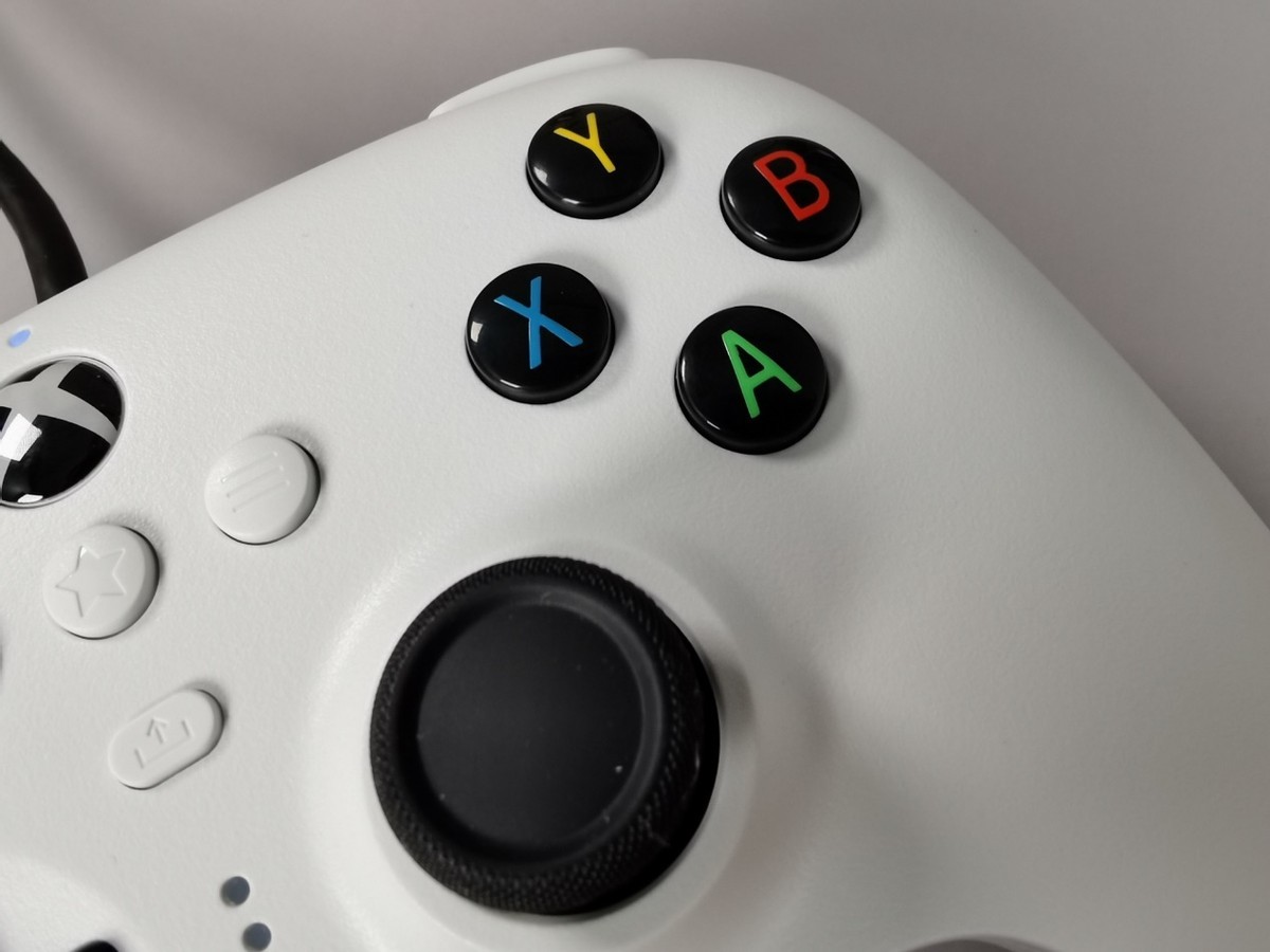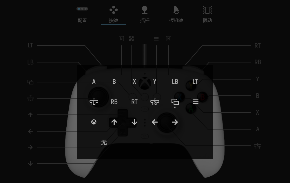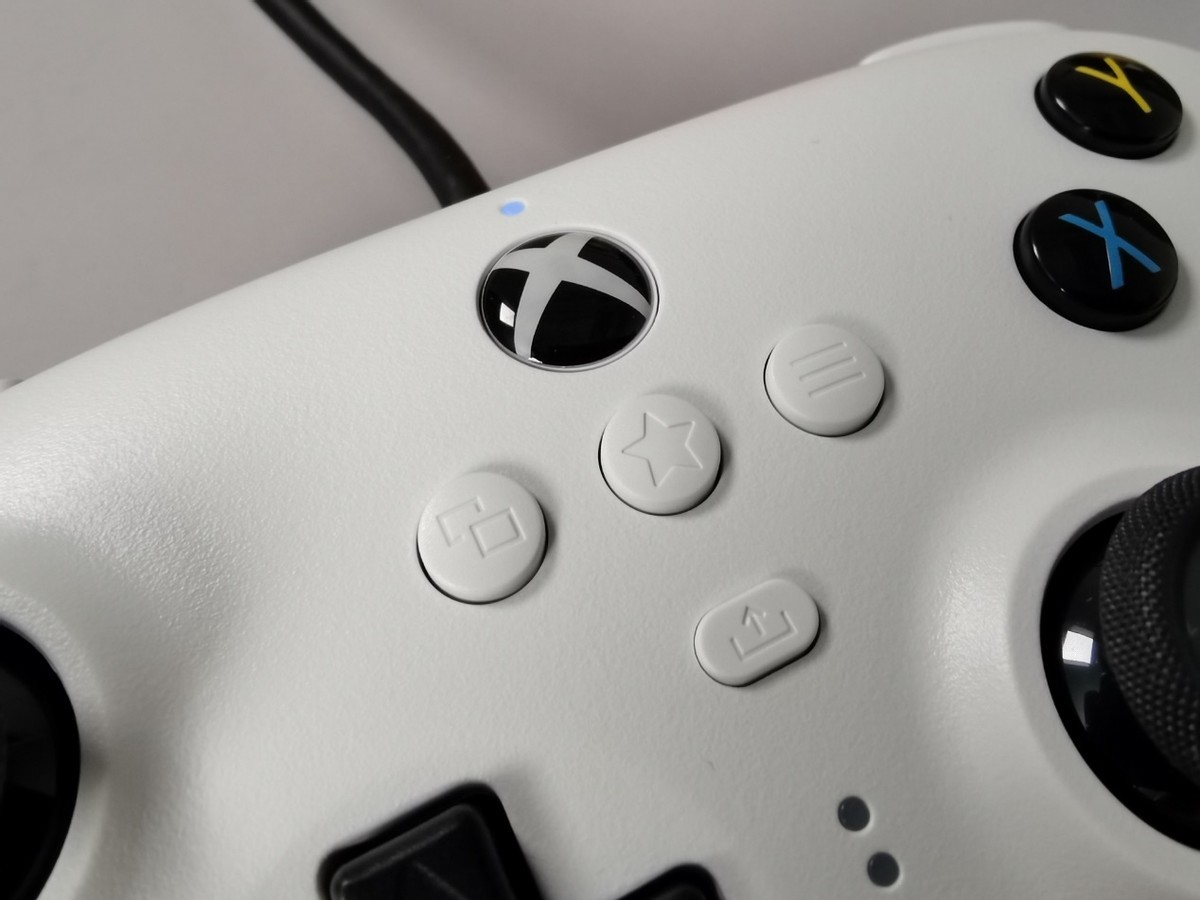 按键分布是左上角左摇杆,左摇杆的右下方是一个十字按键,十字按键的右侧是右摇杆。十字键和右摇杆之间右3个配置指示灯,指示灯下方是一个印有八位堂LOGO的配置键。手柄的正上方是Xbox键,Xbox键上方有一个状态指示灯,下方有3个按键,分别是视图键、星号键和菜单键,然后就是右上角的ABXY键。