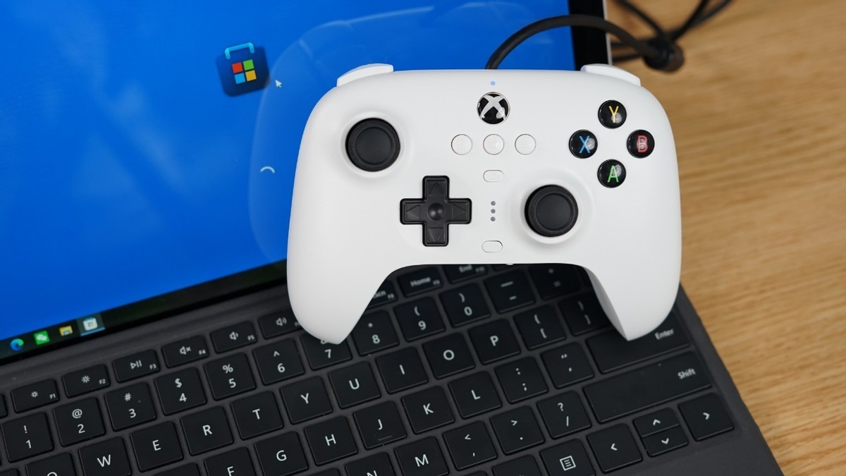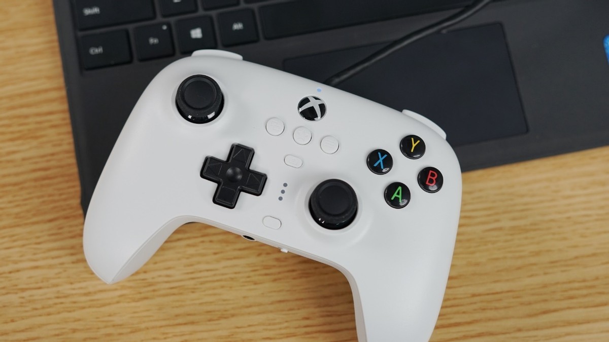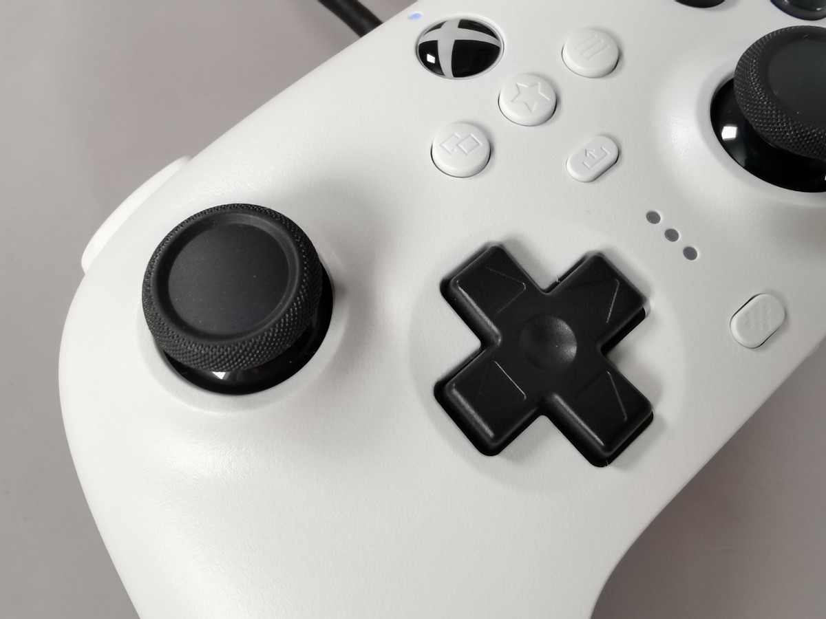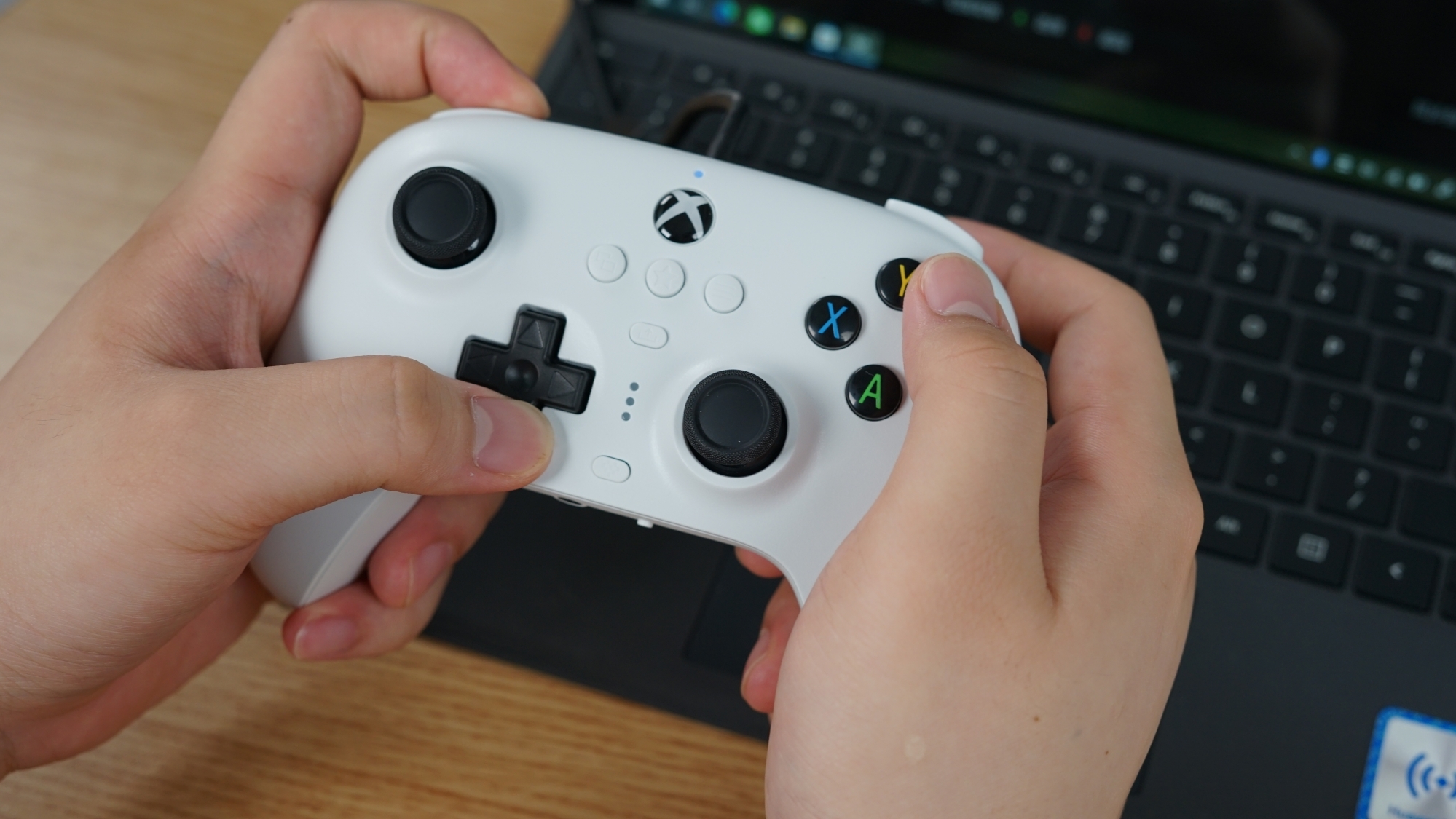 按键分布是左上角左摇杆,左摇杆的右下方是一个十字按键,十字按键的右侧是右摇杆。十字键和右摇杆之间右3个配置指示灯,指示灯下方是一个印有八位堂LOGO的配置键。手柄的正上方是Xbox键,Xbox键上方有一个状态指示灯,下方有3个按键,分别是视图键、星号键和菜单键,然后就是右上角的ABXY键。