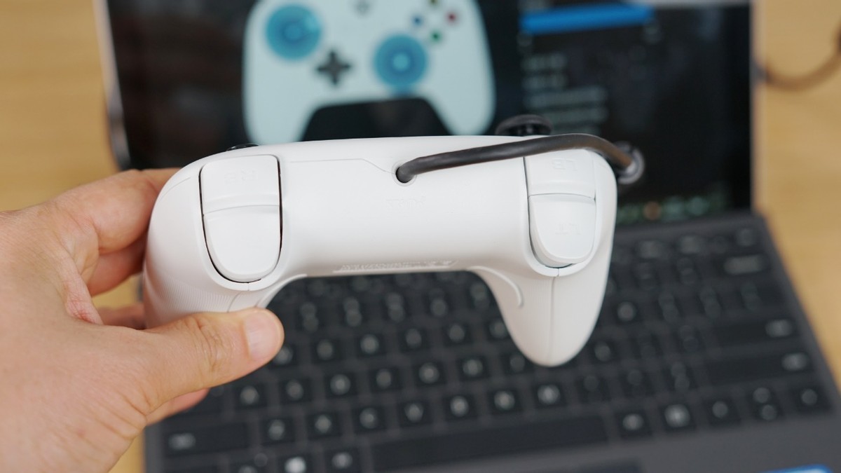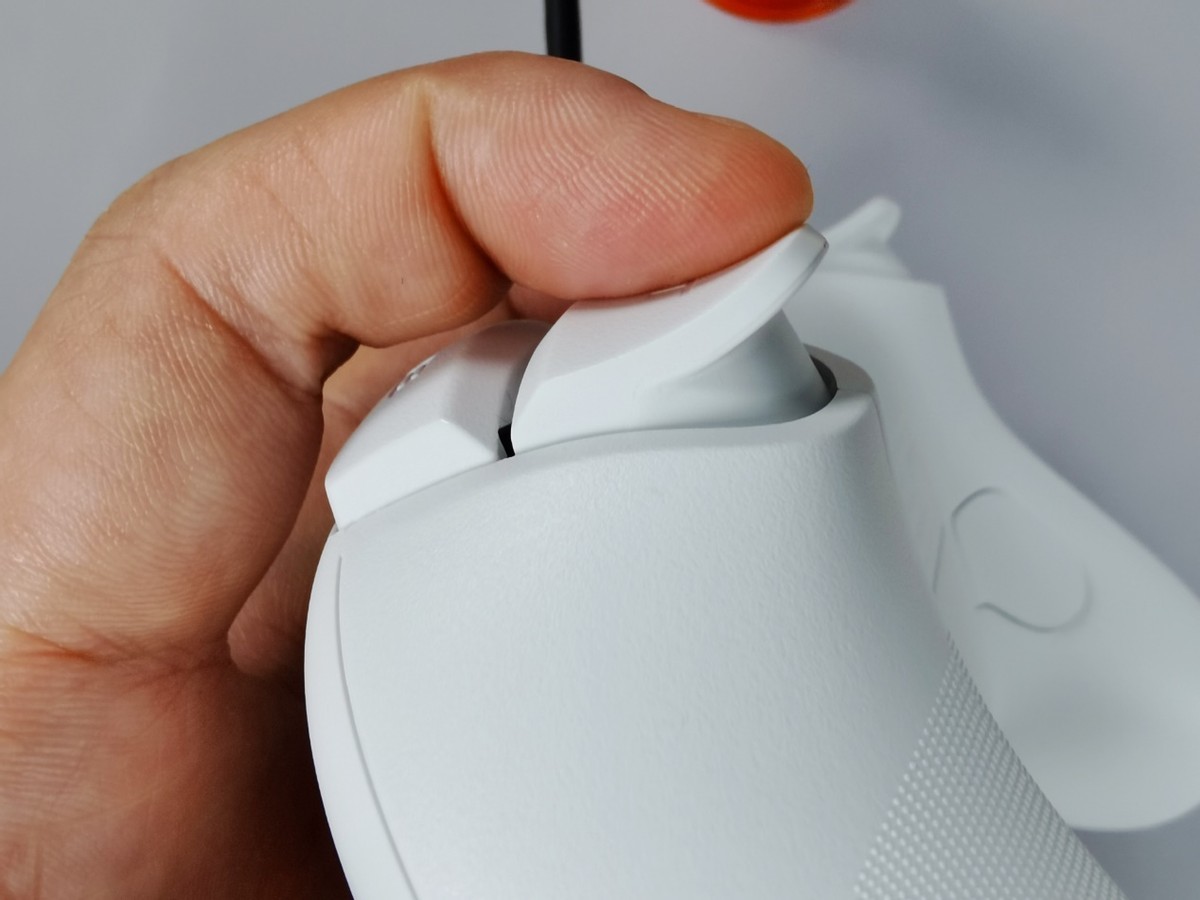 手柄的顶部还有4个按键,左侧为左肩键和左扳机键,右侧为右肩键和右扳机键, 肩键的手感舒适,回弹力度适中,食指操控非常舒适。扳机键采用霍尔磁感应扳机,手感非常顺滑,几乎没有阻尼感,体验非常好,并且带有震动功能,配合支持扳机震动的游戏,那体验爽歪歪。