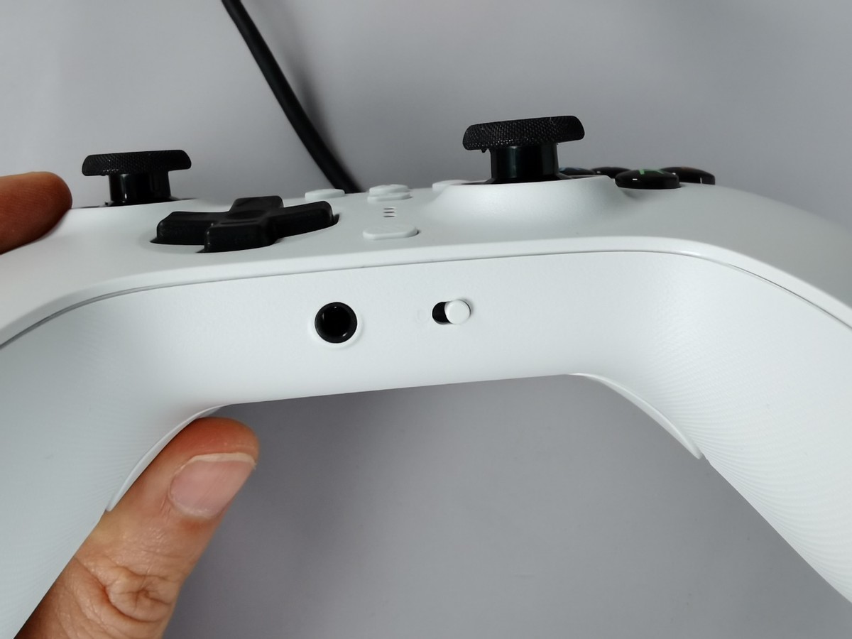 手柄的底部中间位置还有一个3.5mm音频口,方便玩家连接耳机,尽情地享受游戏,又避免吵到身边的人,耳机孔旁边还有麦克风开关,玩家可根据需求选择是否开启麦克风。