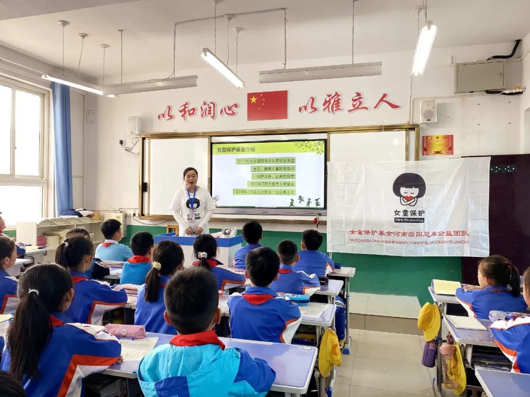 2022年4月6日,女童保护基金陕西渭南市婚姻家庭教育协会团队走进陕西省渭南市临渭区桥南镇中心小学,志愿者讲师秦英为130名孩子讲授了3堂“爱护我们的身体”儿童防性侵课程,并发放儿童防性侵手册儿童版130本。共同参与活动的志愿者还有别秀娟。