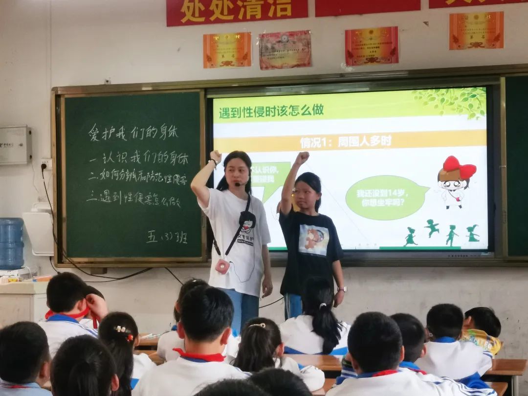 2022年4月1日、2日、13日、14日,女童保护基金湖北松滋公益助学社团队走进湖北省荆州市松滋市黄杰小学、沙道观镇沙道观小学、洈水镇大岩咀小学、洈水镇西斋小学,志愿者讲师代红燕、杜旭琼、黄年菊、兰正韦、刘丹、刘进、裴先菊、吴丽丽、许庆华、尤小娟、朱丹丹为1510名孩子讲授了28堂“爱护我们的身体”儿童防性侵课程,并发放儿童防性侵手册儿童版1510本。共同参与活动的志愿者还有曹俊、兰正苇、雷海燕、潘晓媛、潘银姣、杨宝。
