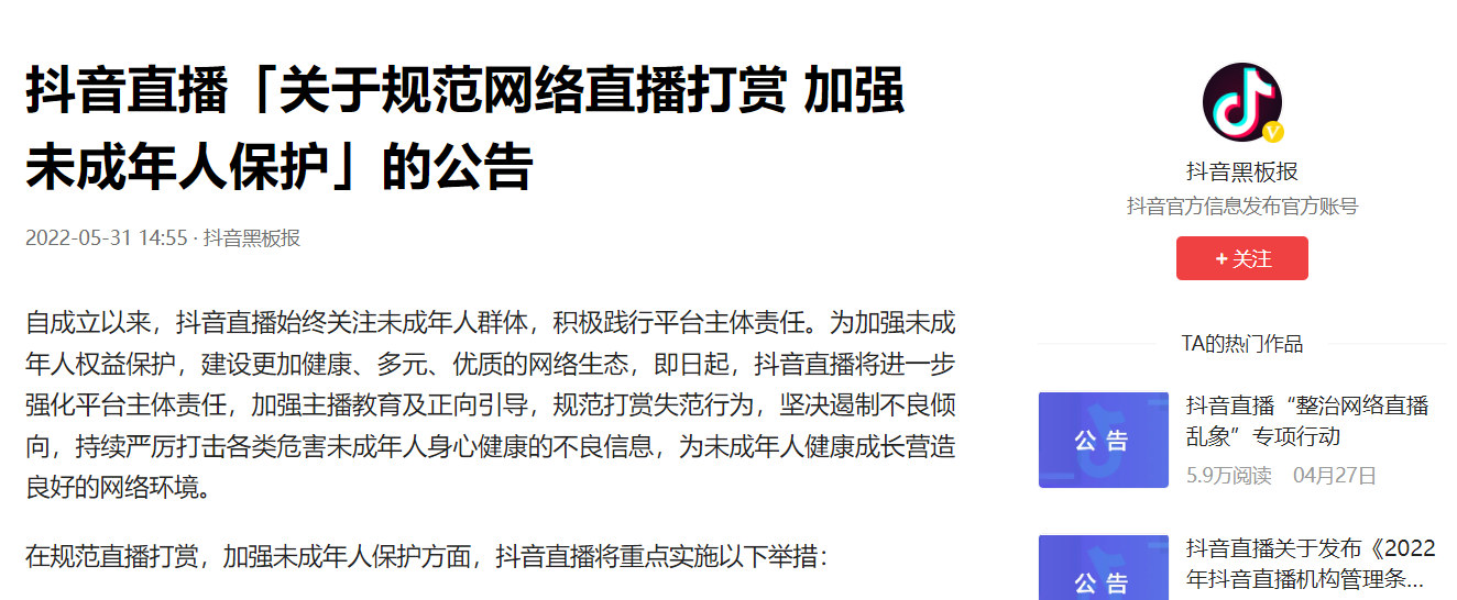 IT之家 5 月 31 日消息,头条号“抖音黑板报”今日发布抖音直播「关于规范网络直播打赏 加强未成年人保护」的公告,全面整改抖音直播榜单功能。