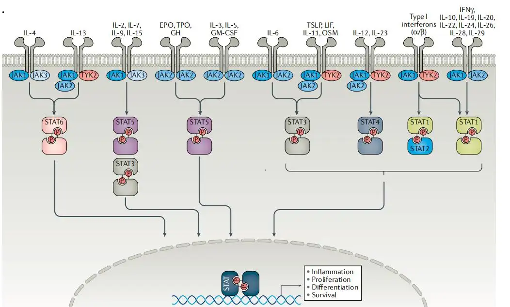 随着研究的不断深入,越来越多的炎性因子及其信号通路被发现,这些炎性因子及信号通路涉及了多种不同的疾病种类,有可能成为解开自身免疫性疾病治愈大门的钥匙。其中JAKs (Janus kinases)被发现是许多下游炎性细胞因子必需的信号转导介质。JAKs为一类非受体型酪氨酸激酶,包括JAK1、JAK2、TYK2和JAK3。配体诱导受体聚集使JAKs活化,活化的JAKs可使受体磷酸化,进而活化另一种STAT蛋白。JAKs和STATs是许多细胞因子受体系统的重要组成部分,是一条与炎性细胞因子密切相关的细胞内信号转导通路。