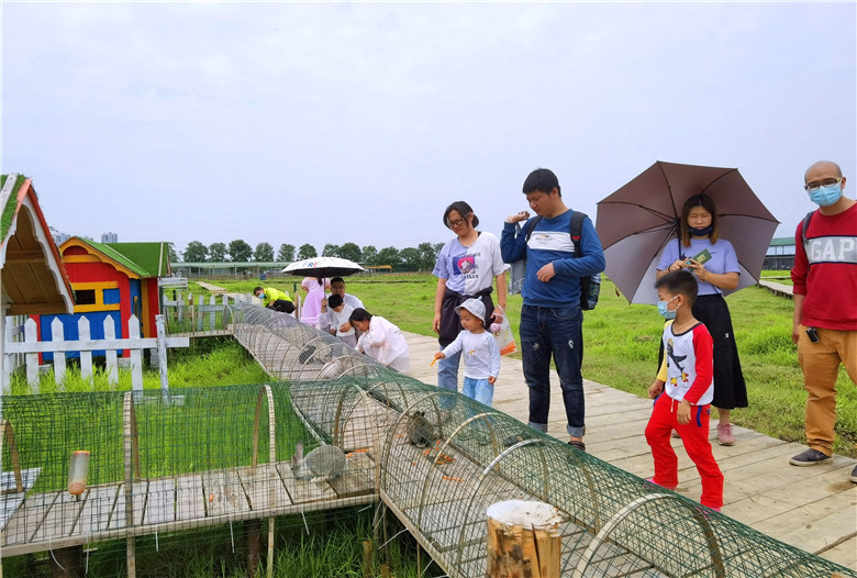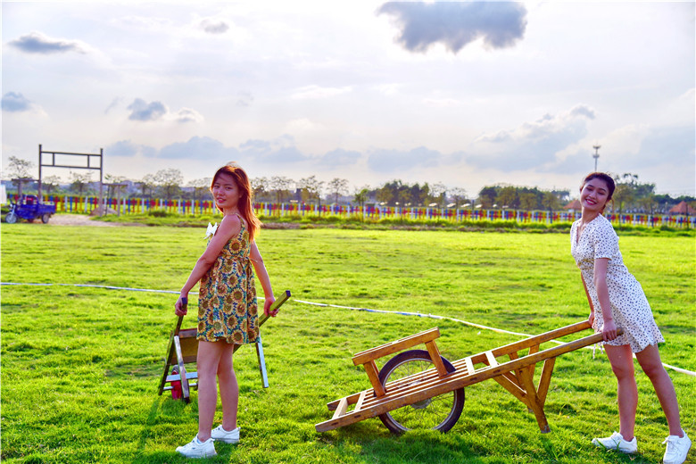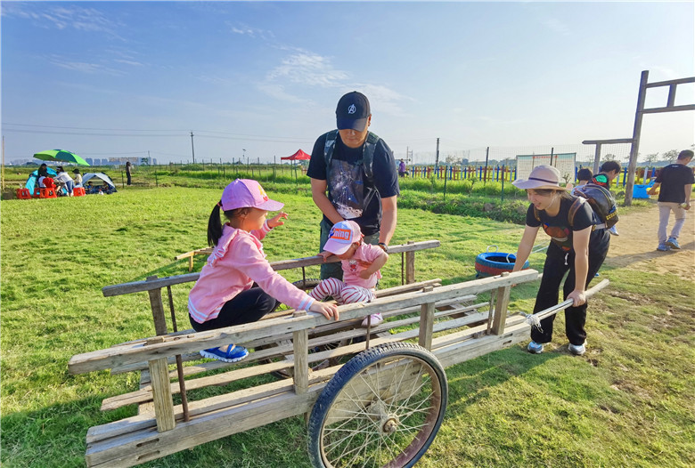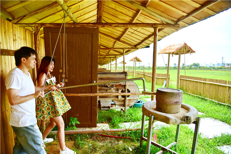 一家人可以玩农具,农趣园里有石磨、碓、风车、鸡公车,推磨踏碓摇风车推鸡公车交公粮,这些农村曾经的老把式化身为游客们喜欢的游乐项目,大伙玩得乐不思归。