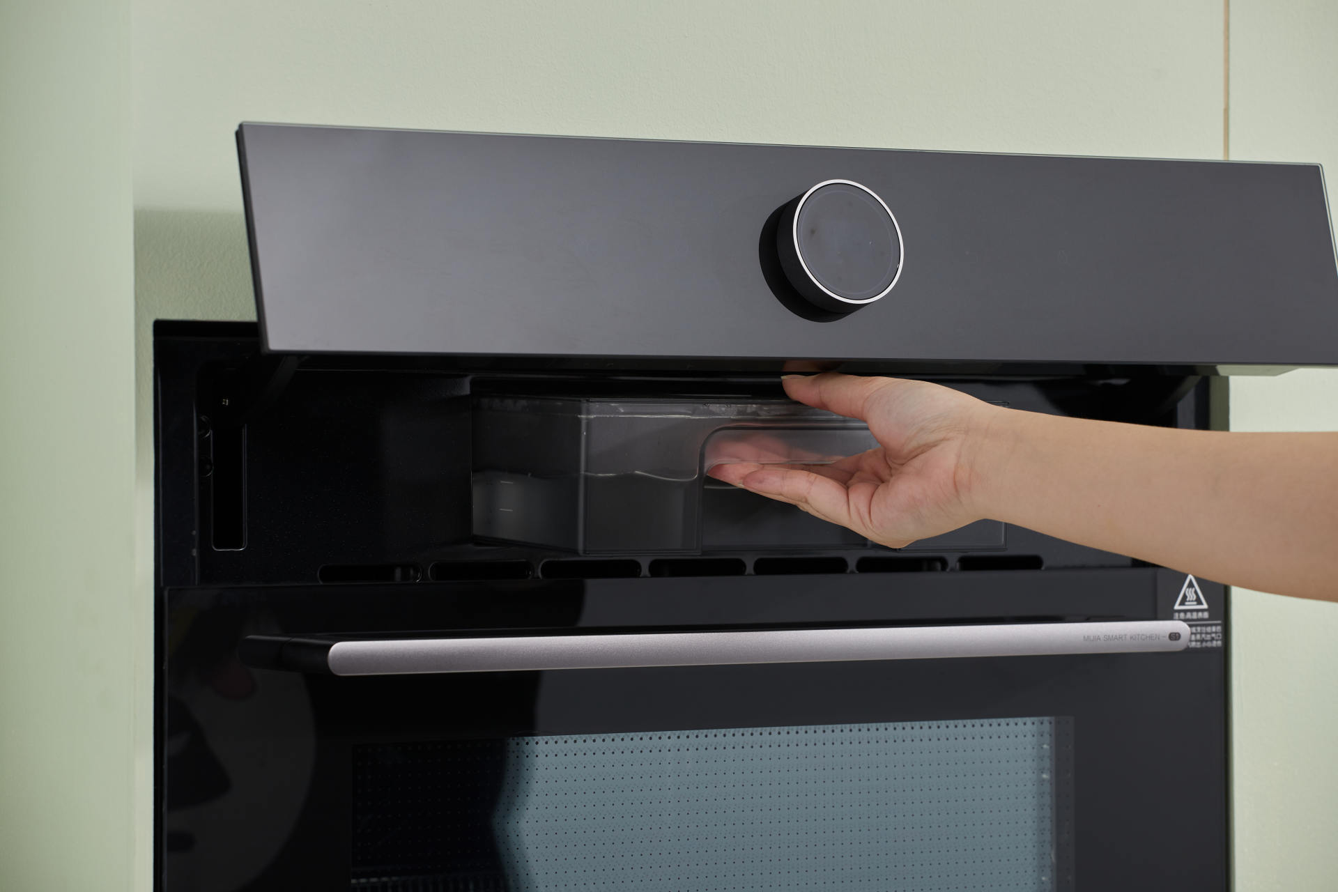 有蒸箱功能,必然就有加水的需求。米家这款蒸烤一体机在外观美感和操作便捷之间找到了一个巧妙的设计思路。将水箱隐藏在控制面板里,通过按键实现控制面板自动升降,从而实现不开门加水的操作,烹饪途中加水也不影响烹饪。