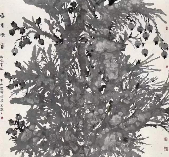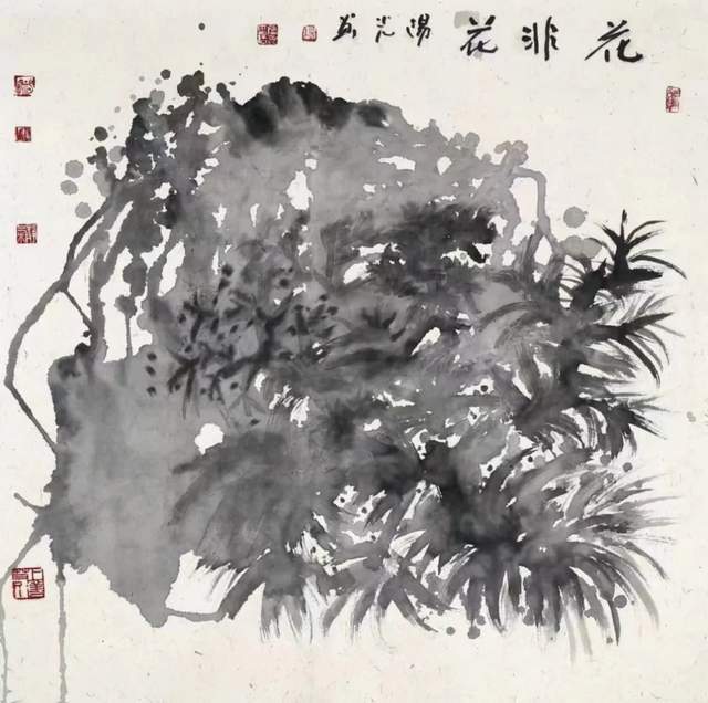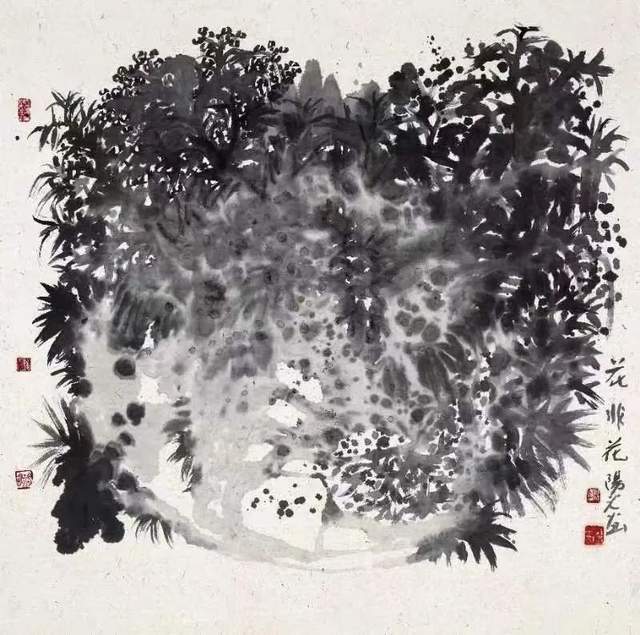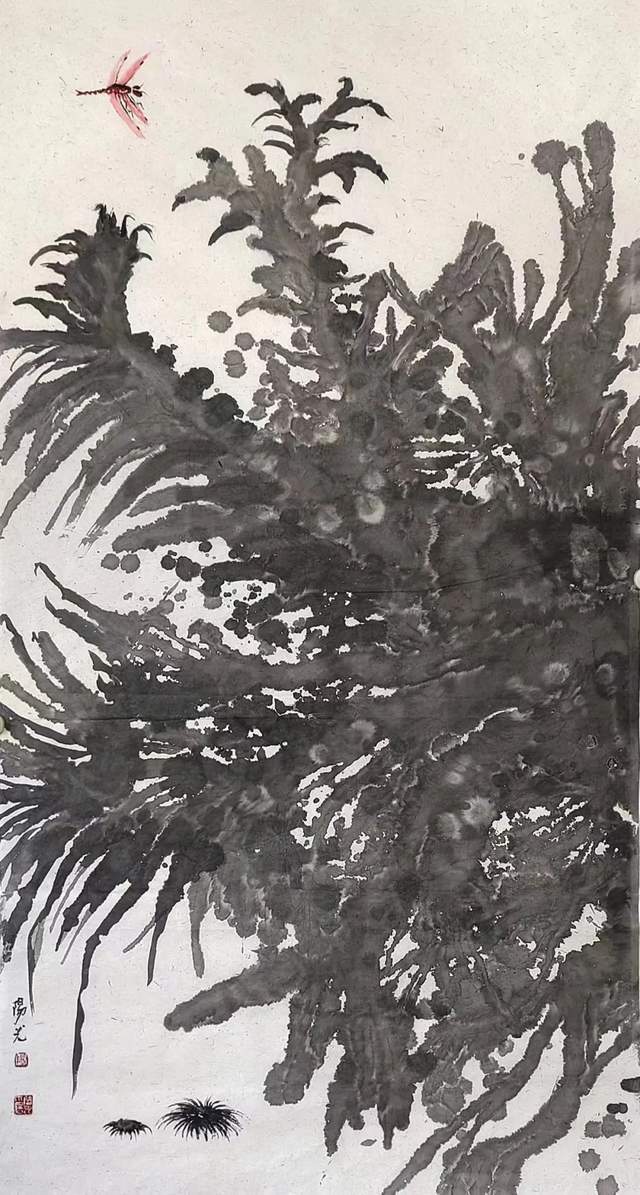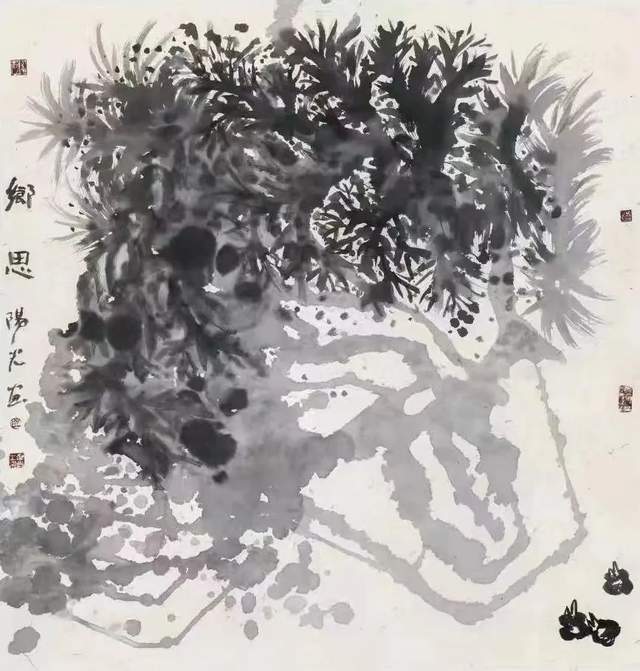 阳光近些年所画的水墨画,除了一些尺幅巨大的作品,还画了一些笔简意赅、尺幅相对较小的作品,归纳起来题为《花非花系列》、《家乡风情系列》。应当说,这两个系列属于花鸟画范畴,前者是以花为图,后者是以果为像。当然,这两系列中的题材不是画家刻意为之,大都源自生活中的自然而然,当进行宏大的桂林山水为主题创作前,需要大量地写生,他在画层峦叠嶂或高山峻岭的同时,也画些柳岸、江村、柏屋、竹舍,还有荷田、水塘以及无名的花卉与野果,也正是这些花卉与野果触动了他心理的记忆,迸发出乡愁、乡恋与乡情。需要指出的是,时代在变化,人们的审美也在变化,面对当下的情境,画家其根本问题是形式语言的探索创造,而不是依旧用过去的画法来表现,凡能载入史册的画家,并不是丰富的人生,而是他个性语言创造风格化。故而,依照传统花卉方法来创作,难以有所作为,必须构建出一种新的创作方法和视觉图式。作画之始,面对无名的花卉与野果,舍其像,取不太像,或像与不像之间,看花不是花,不是花又是花的意象造型观。果是大点、小点、白点、黑点,是墨点又是果,是果又是墨点,墨点似果,果果为墨。这些都尽量远离传统模式,只强调用笔书写的变化和水墨的泼洒,作为一种肌理和色彩的需要。画面引入平面构成,一种有意味的笔墨意象,一种有别于传统的空间结构,带给我们一种现代视觉图式。