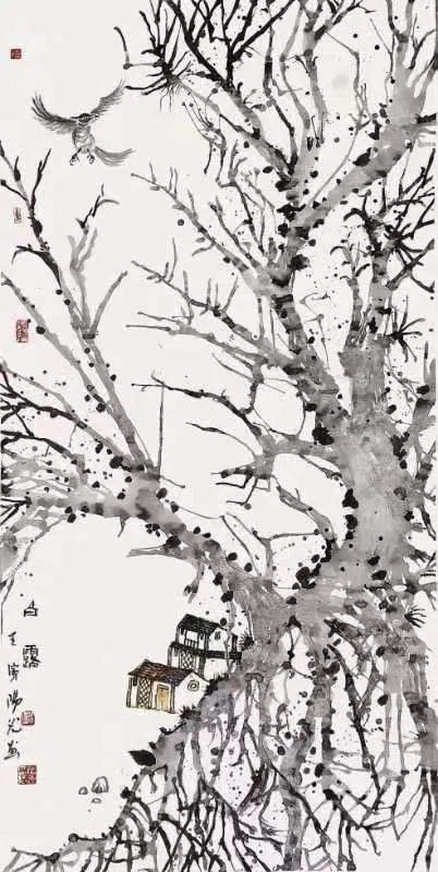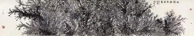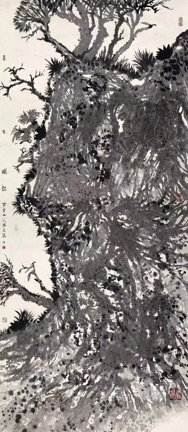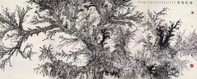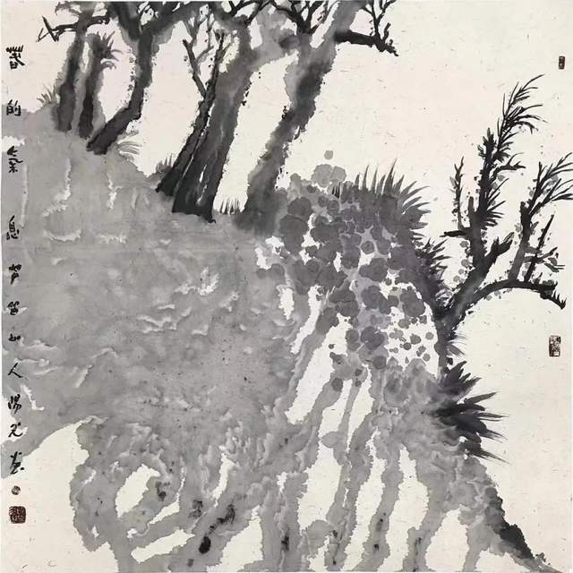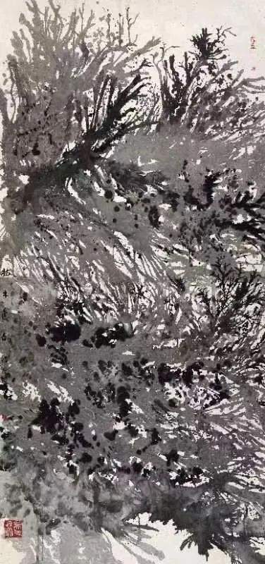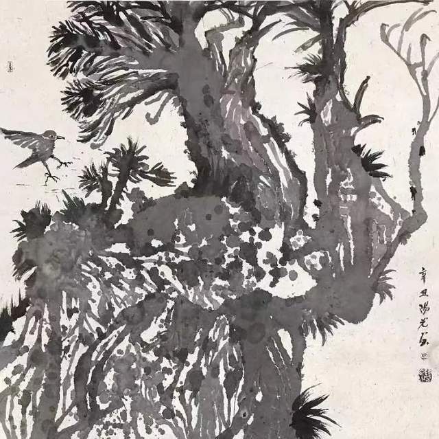 应当指出的是,《古树系列》不依某家某派,既不从古也不跟当代流行画风,是一种笔墨意象与现代视觉图式的新探索。尽管如此,画家并没有求新而放松对传统笔墨特性及技巧的要求。方法上,继承传统没骨画法,如椽大笔,干湿浓淡自由挥写,线条遒劲而强悍,且长与短、曲与直、粗与细、疏与密的对比,在随意自然中一气呵成,如同书法中写行草书一般,痛快淋漓,细毫无雕琢巧设之迹,尔后用墨点苔痕,用水冲撞,勾写与泼染结合,透出“笔晕墨章”的华滋。造型上,不以具像,采取意象,在似与不似之间。在构图上,摒弃传统构图方式,采取平面构成,目的是追求整体构成中的视觉张力与现代观念的表达,尽管画面充溢密密匝匝的纵横点线,然毫无杂乱零碎,画面单纯、完整、统一,气势弥满,写意畅神,真情地表达出树的性格与精神。应当说,《古树系列》其实是一个浩大的艺术工程,标记着对传统的承接与转化,对自己的艺术一个改造和再造,如此题材的选择,如此巨大的尺幅,如此置陈布势,如此的水墨语言,这在中外美术史上鲜有其比。