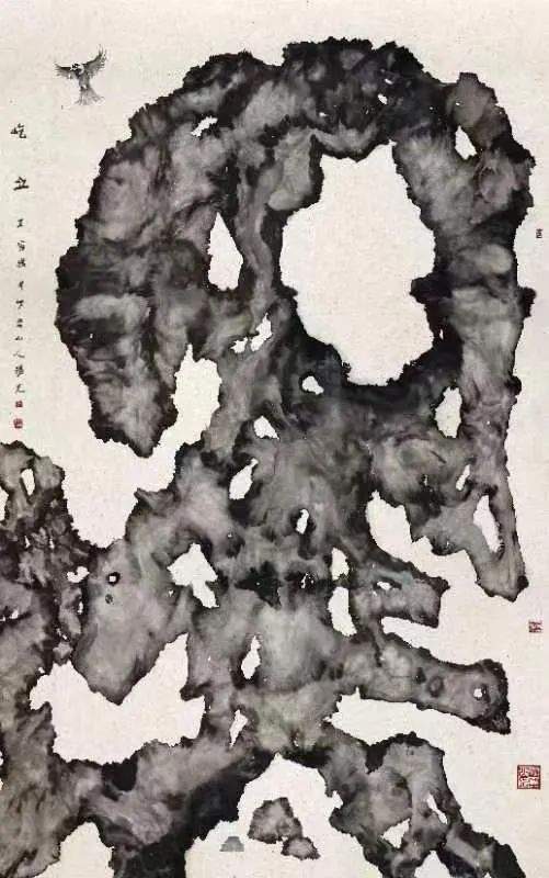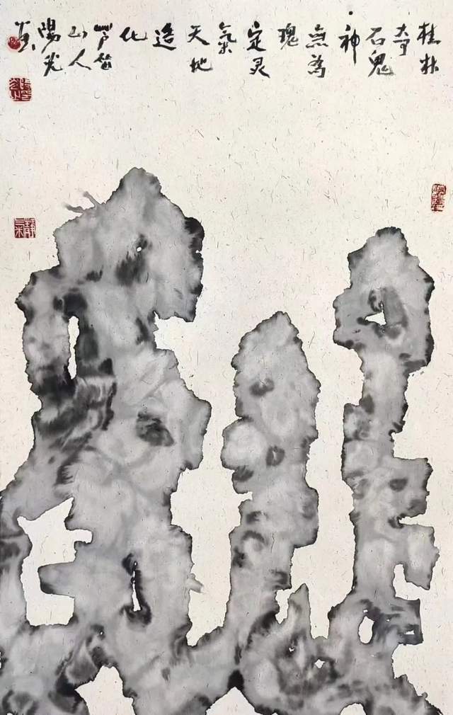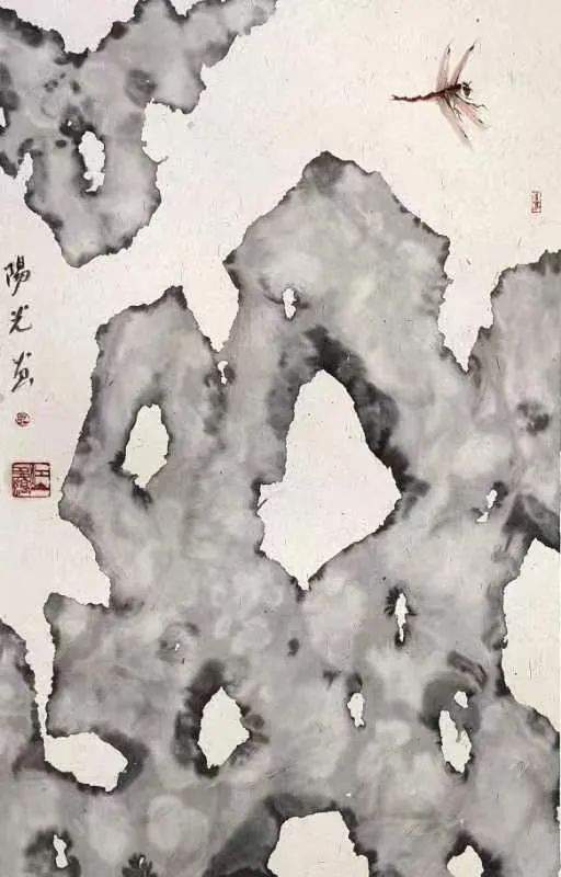 应当指出的是,喀斯特地貌不仅造化旖旎的桂林山水,也形成桂林洞奇、石美。桂林有多处溶洞,奇异的美石遍布各个角落,有藏在洞里,有长在地上,有潜在水里。应当说,石有万年沉积苍古之质,始自然之性;人们撷取可欣赏于心神之间,开文人之趣。清代蒲松龄有诗言:“爱此一拳石,玲珑出自然。”拳拳一掌,盈盈一石,静置案头,静心养正,正是历代文人的审美情趣。当然,画家也不例外,宋代米芾曾言:“石奇丑,足当吾拜。”他尊石为兄,自号“石痴”。苏轼也爱石,留下《丑石风竹图》,郑板桥爱画石,谙合他坦荡坚挺的性格。古往今来画石的名家林立,从这个意义上说,阳光画石也面临抉择:是依照传统勾皴点染之法,画石头之态;还是继承传统某些表现方法,运用现代意识,开拓画石的新语言。阳光选择了后者,他充分运用传统没骨法和相互发生关系的媒介材料和水的作用,具体地说,他是用大笔醮墨写出石头姿态和大体的形状,尔后用浓墨破淡墨地在石头的边缘积染,形成块面组合和阴阳变化,再用淡墨点洒大小不样墨点后泼水冲撞,要求所画的石头形象而生动,并凸现出质感、骨感与肌理感。在同一色阶里有黑、白、灰的变化,也有水墨相互融合带来视觉张力,它既有笔法,又充溢着墨韵、墨气和墨味。为了丰富画面,增添画面的气氛,在石隙处,或石偏旁处画上鱼儿、蜻蜓、鸟儿之类小动物,形成大与小、动与静的对比,又增强了作品的趣味性和欣赏性。