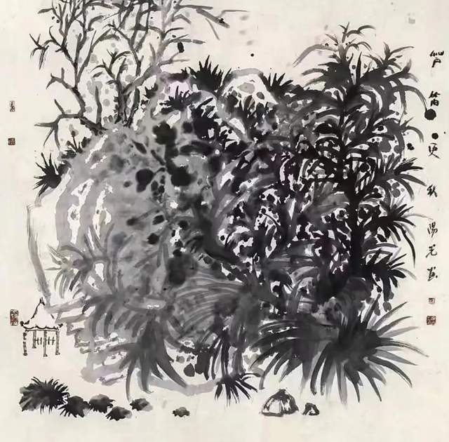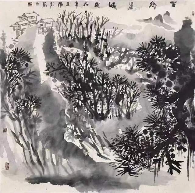 几年之后,阳光的山水画进行了一次变化。在构图和造型上,不特别追求“三远”透视法取得的全景山水,而有意削弱画面空间纵深感,多用近景与中景,剔除远景,力图引入平面结构。造型上,强调概括物象大体形状,不重细节描绘,重视笔线的排列和书写的节奏。画法上,淡墨勾勒山石物象,提按顿挫,外方内圆,少许皴擦,浓墨横点,上下排奡,从而与当时流行写实山水和装饰化都拉开了距离,给人以耳目一新的感受。