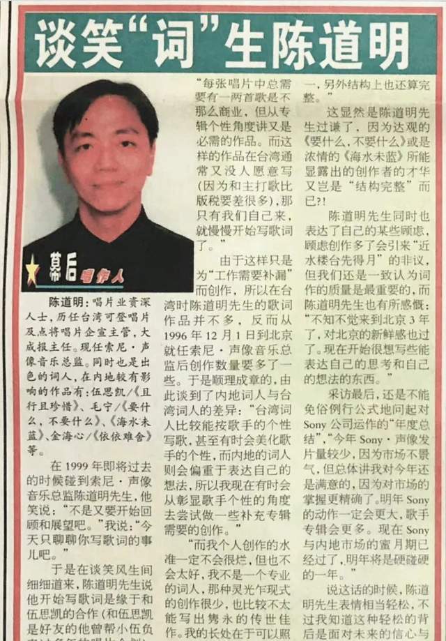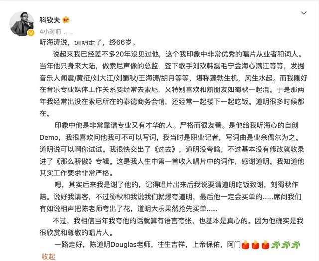 唱作人陈道明于6月1日去世,他不仅是个作词人,同时也是一位音乐总监。不少网友可能对创作人陈道明并不熟悉,但他在做摄像总监的时候,签下过许多知名歌手,也发掘过不少有音乐天赋的新人。