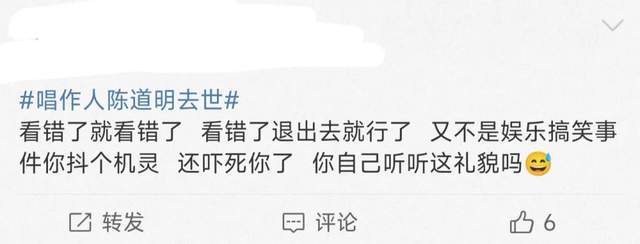 从营销号们的行为中,可以看出他们对逝者是很尊重的,没有利用这种不好的消息来吸引眼球。即便营销号们已经十分小心,但仍有网友管不住嘴。在评论区里留言,以为是演员陈道明出什么事了。