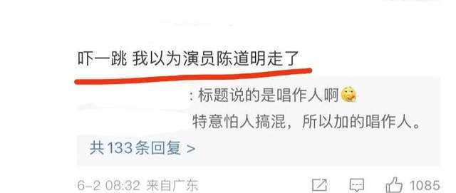 很多网友根本不会审题,选择性遗漏了“唱作人”三个字,直接将唱作人陈道明代入了演员陈道明,还悲痛地表示自己太喜欢陈道明演的戏了,感慨意外来得太突然。