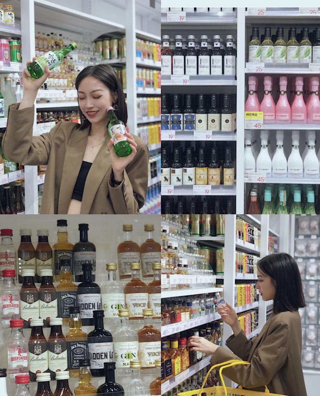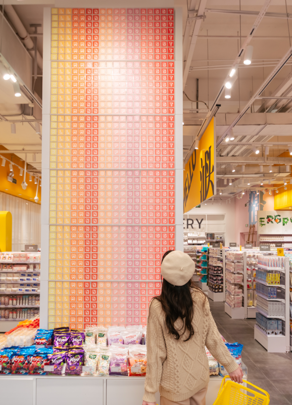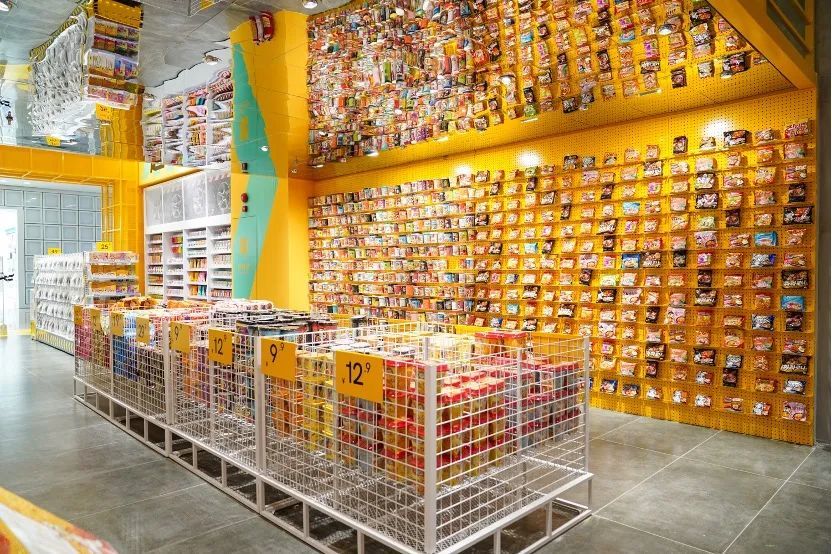 其次,墙式陈列新意十足。当司空见惯的传统门店,变为口红墙、零食彩虹墙、红酒墙的线下集合仓,购物被赋予仪式感。