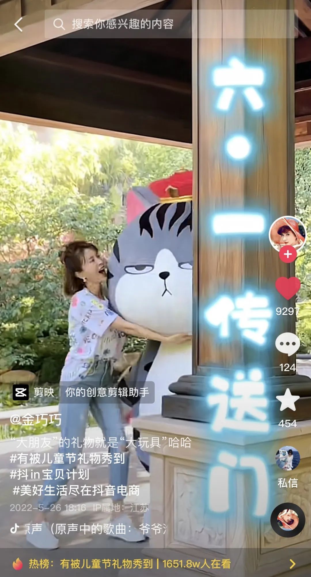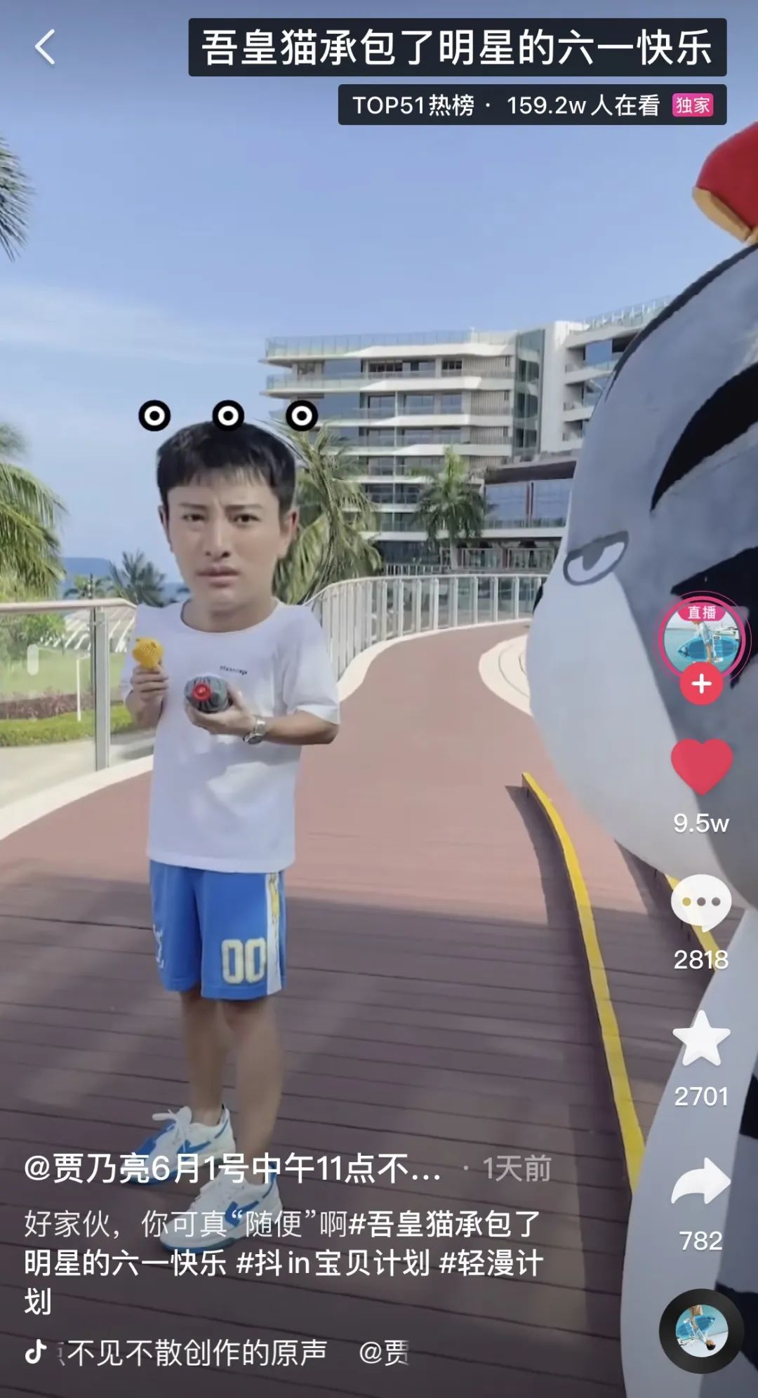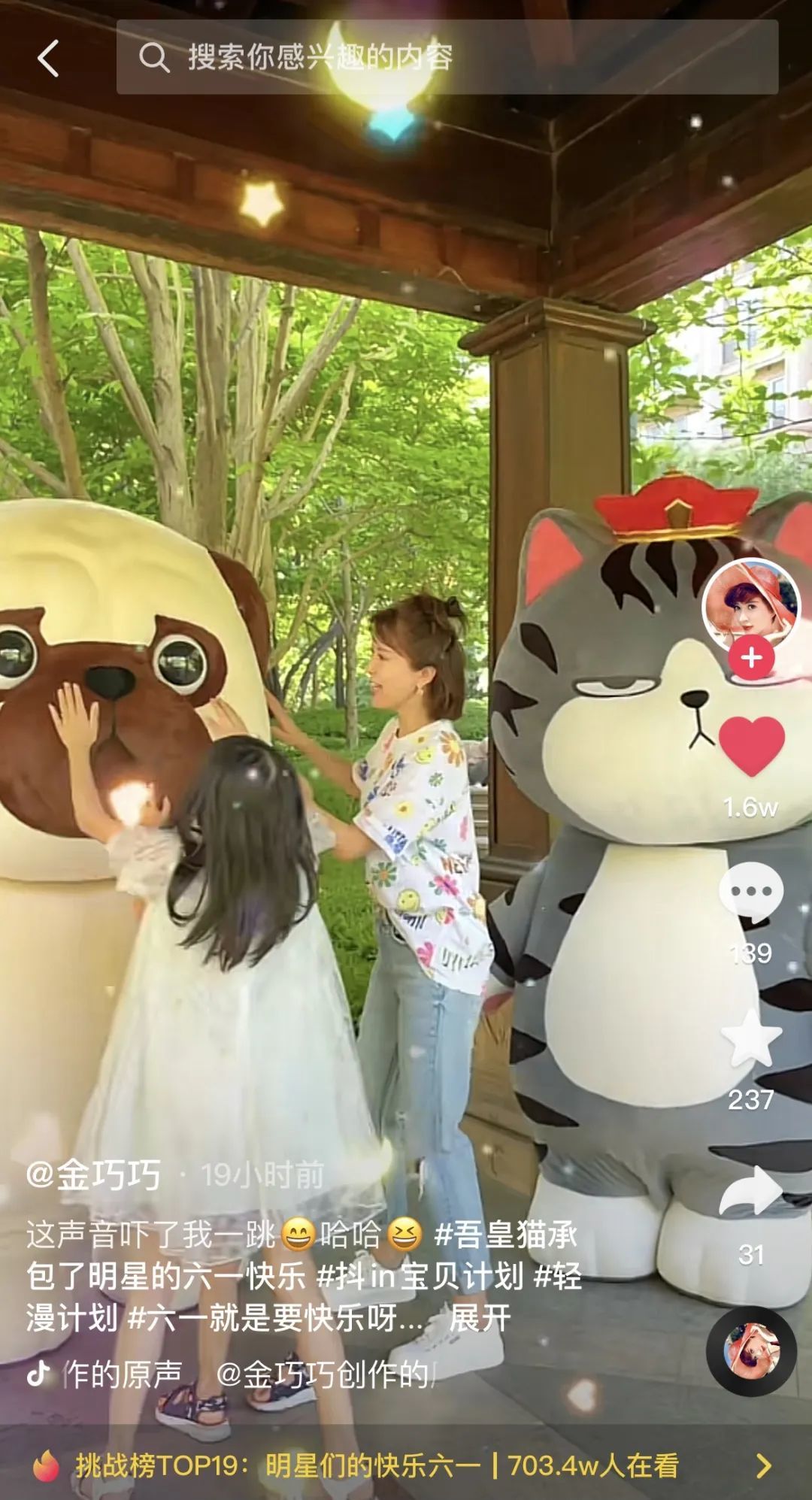 6月1日当天,“小寿星”吾皇猫和巴扎黑承包了大朋友们的儿童节礼物,破次元“空降”到了@贾乃亮、@黄奕向前、 @程莉莎、@肉松夫妇(陈松伶&张铎)、@金巧巧、@黄宥明、@李乃文 的身边,为儿童节更添一份欢乐,抖音话题#吾皇猫承包了明星们的六一快乐#也一度登上抖音热榜及抖音挑战榜第三位,播放量达2248w。