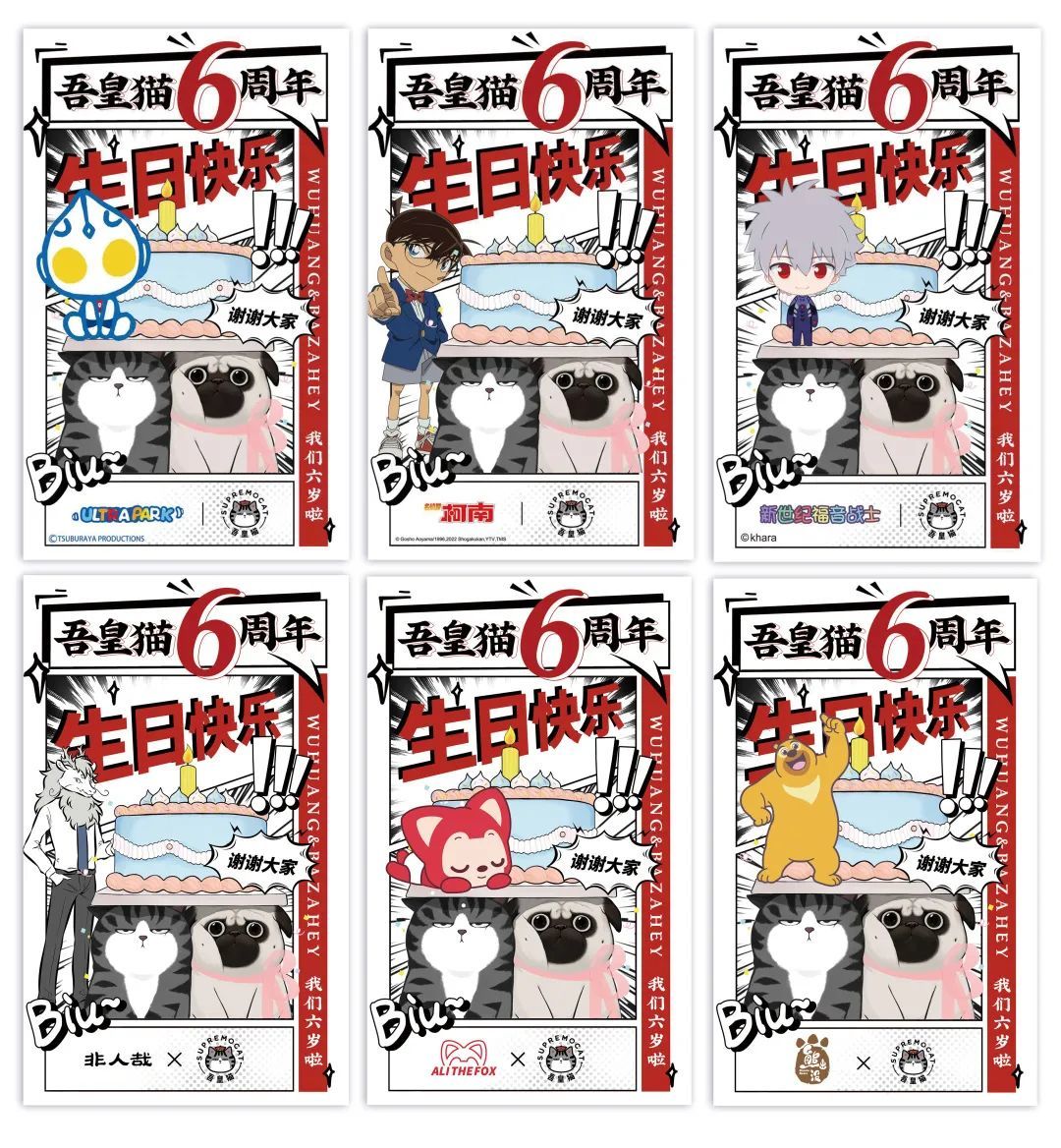 注:奥特曼、柯南、eva、阿狸、非人哉、熊出没等动漫人物与吾皇猫、巴扎黑同屏庆生,以上为随机展示。