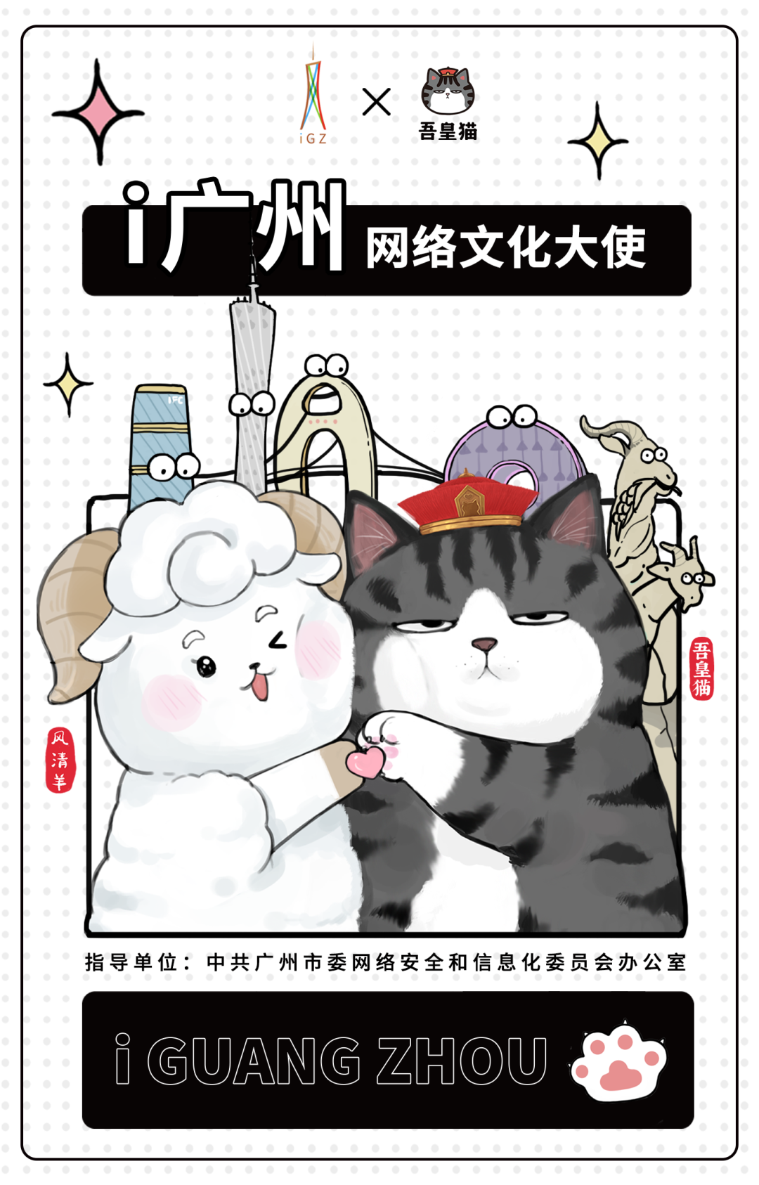 吾皇猫还在2021年9月被中共广州市委网络安全和信息化委员会正式授予“i 广州网络文化形象大使”称号,吾皇猫与广州市委网信办动漫ip“风清羊”一起组成cp,打卡广州“红八景”地标,带领大家感受红色经典、羊城文化。