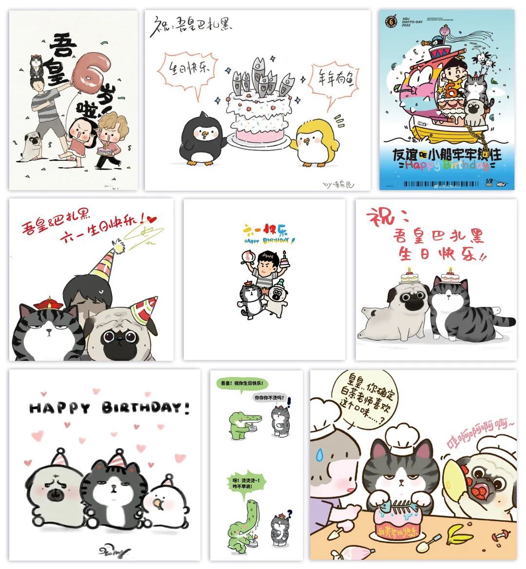 注:@牛轰轰 、@喃东尼、@黄逗菌HDJ、@ 幽灵-馒头、@大绵羊BOBO、@郭斯特、@花栗鼠、@小矛Toby、@小曲奇-Cookie等漫画家都为吾皇、巴扎黑和少年送来了生日祝福,以上为随机展示。