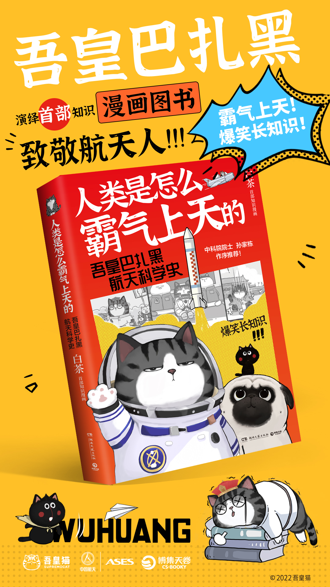 自2021年起,吾皇猫便与中国航天科技集团公司第八研究院合作,并联合人民日报新媒体、央视新闻发布了多条航天主题科普漫画,在吾皇猫、巴扎黑的演绎下,航天领域专业知识变得趣味十足,更具备传播性,使得航天知识普及到更多人群,收到了很好的反馈。于是,在2022年4月,吾皇猫联合中国航天|ASES带来了由吾皇猫、巴扎黑演绎的首部知识漫画科普图书《人类是怎么霸气上天的:吾皇巴扎黑航天科学史》,图书由中国航天科技集团有限公司科普专家委员会指导审订,中科院院士孙家栋作序推荐,书中以电影式全场景再现航天史上的重要进步事件,以此献礼、致敬拼搏奋斗的航天人。吾皇猫、巴扎黑也成为读者与航天之间的桥梁,不仅链接了青少年读者的“探索之心”,同样也为全年龄段读者构筑了“航天梦”。