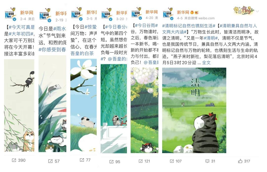 2021年末,吾皇猫联合新华网共同策划并上线了#这9个问题你敢答吗#吾皇猫巴扎黑年度“灵魂问答”趣味单图,以大主题小角度,在喜闻乐见的表述中传递出积极向上的正能量。随后,2022年,吾皇猫还与新华网联合发布了“二十四节气”系列插画,以卡通形象视角带大家感受二十四节气的独特文化魅力,相关微博话题阅读量累计已超1.3亿,且随着内容陆续上线,在持续火热传播中。在前不久的“立夏”节气相关话题#愿你生如夏花永远灿烂热烈#还登上微博要闻榜,阅读量超3000w。