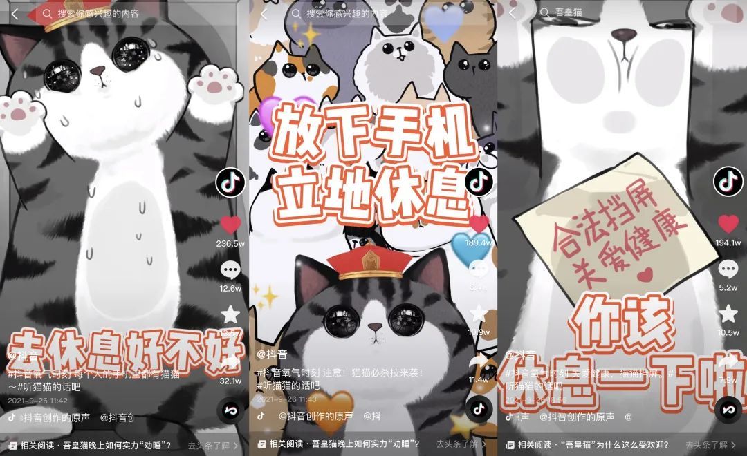 在经历多年磨砺与内容积淀的同时,吾皇猫以更加颠覆性的打法积极尝试突破以往圈层。2021年10月,吾皇猫携手抖音上线了“吾皇猫”系列防沉迷短视频,引导用户更健康地使用抖音,“吾皇猫”或霸气、或卖萌、或温柔地劝导用户“听猫猫的话”,及时放下手机,早点休息。趣味十足、角度新奇的短视频收获了一致好评,上线一个月内播放量累计突破13亿,位列同期上线的卡通IP防沉迷系列视频中播放量的TOP3。