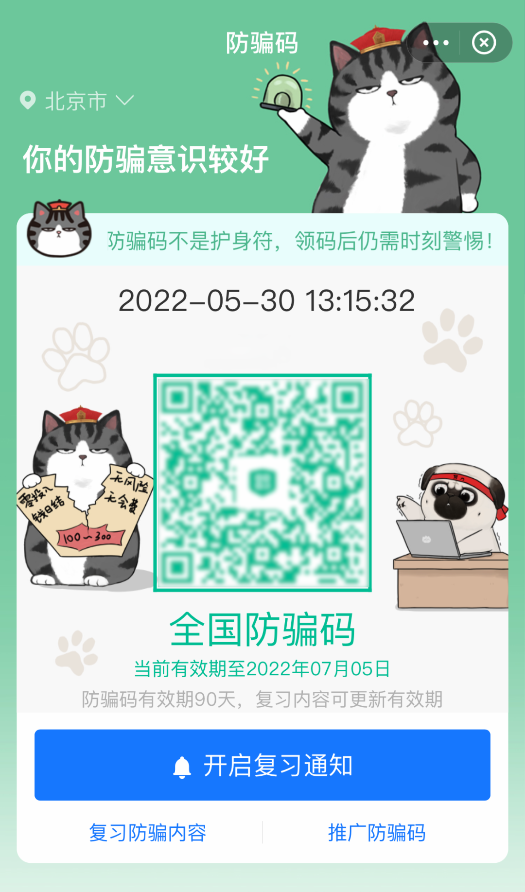 2022年4月,吾皇猫与国家反诈中心、支付宝联合上线“防骗码”皮肤,全新反诈合作成为唯一和首次被编入反诈中心公益宣传手册的漫画内容,未来将与千万大学生在线上、线下见面。