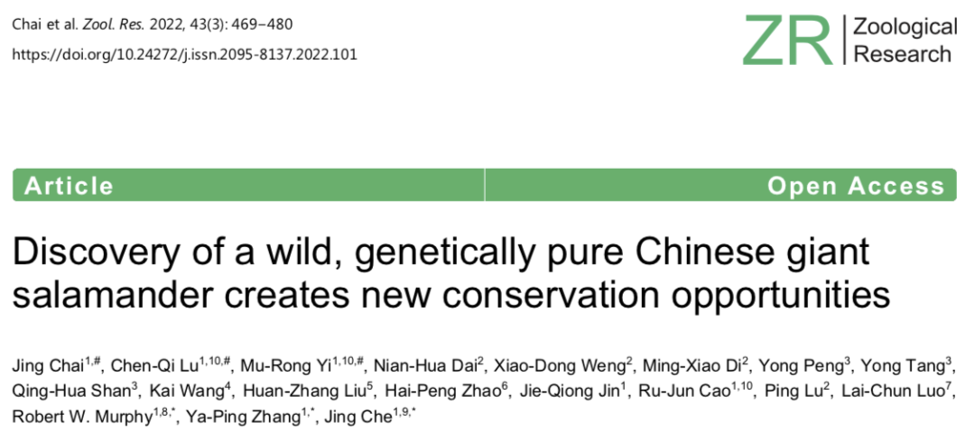 中国科学院昆明动物研究所车静课题组于2022年5月18日在Zoological Research期刊发表了题为“Discovery of a wild, genetically pure Chinese giant salamander creates new conservation opportunities”的文章,文章利用SLAF-seq技术对新发现的江西大鲵进行测序和群体遗传分析,表明江西大鲵是目前我国首个遗传身份明确且野外稳定繁殖的大鲵纯种种群。