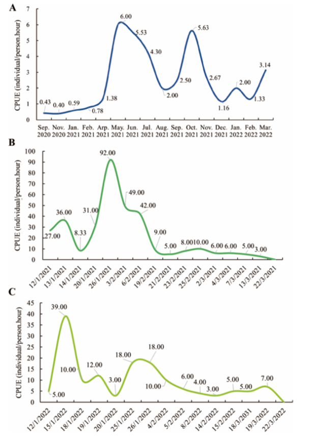 经过2020年9月至2022年3月长达18个月的野外检测,在江西省静安县九岭山国家级自然保护区的某自然保护区内发现一个纯的大鲵野生种群(图1)。采用标记-重捕的方法,在6.50 km的河流生境,146.40人·时的努力下,共发现291尾幼/成体,目击频率高达2尾/人·时(图2A),这一结果显著高于保护区外的目击频率(0.06尾/人·时),甚至高于日本大鲵(0.83尾/人·时)和美洲大鲵(0.45尾/人·时)的野外目击频率。此外,连续两年观察到野外繁殖,共发现了524尾新孵化的幼体,初生幼体的活动期为12 - 2月,1月下旬为高峰期(图2B, C),并确定了需要保护的关键繁殖洞穴。研究结果表明,该物种种群规模较大,强调了建立国家级封闭自然保护区对其进行就地保护的有效性和必要性。