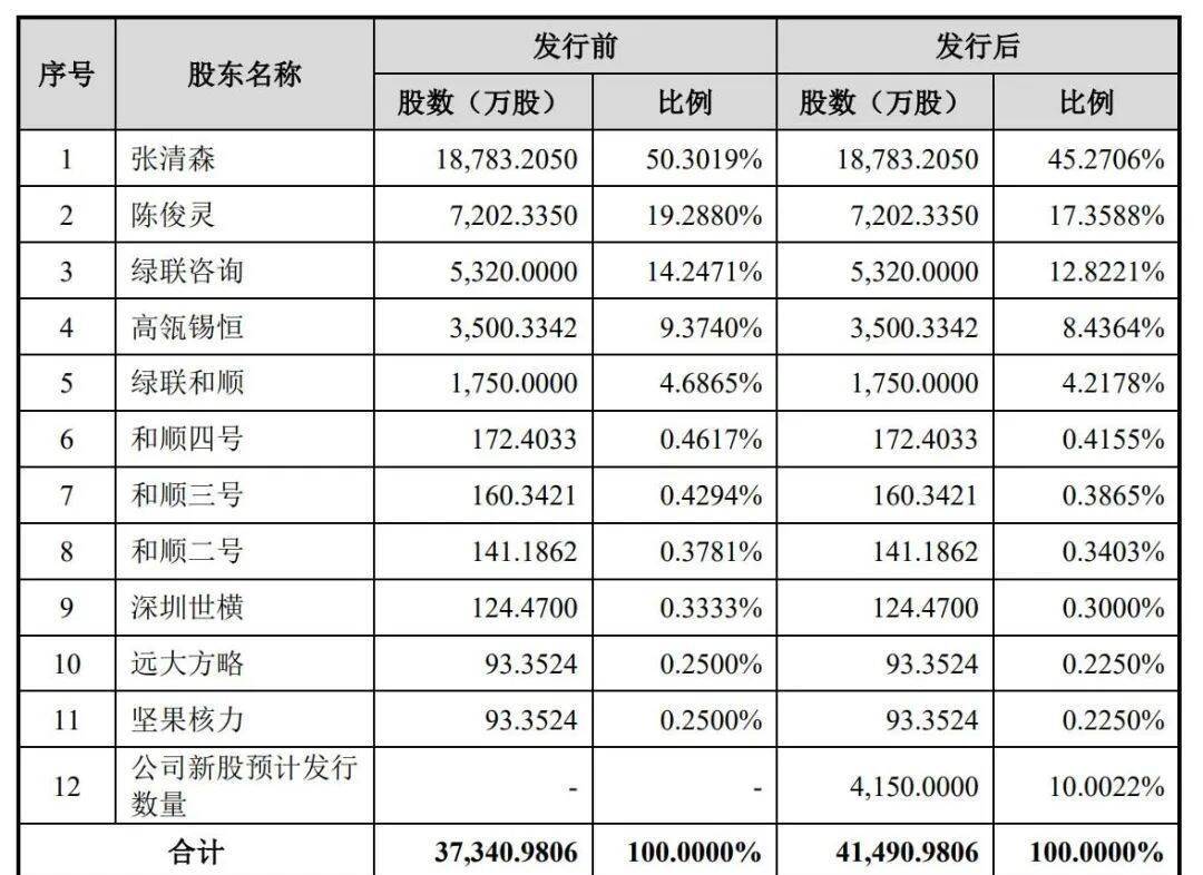 IPO后,张清森持股为45.2706%,陈俊灵持股为17.3588%,绿联咨询持股为12.8221%,高瓴锡恒持股为8.4364%,绿联和顺持股为4.2178%。