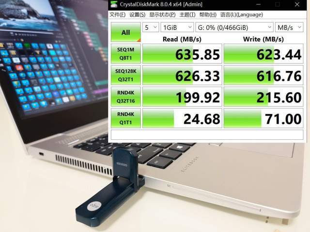 从CrystalDiskMark的测试数据来看,读写速度均超过了600MB/s,实际使用中会受到主机设备、文件属性或其他因素影响,所以不同使用环境可能会有速度不同的情况,属于正常现象。