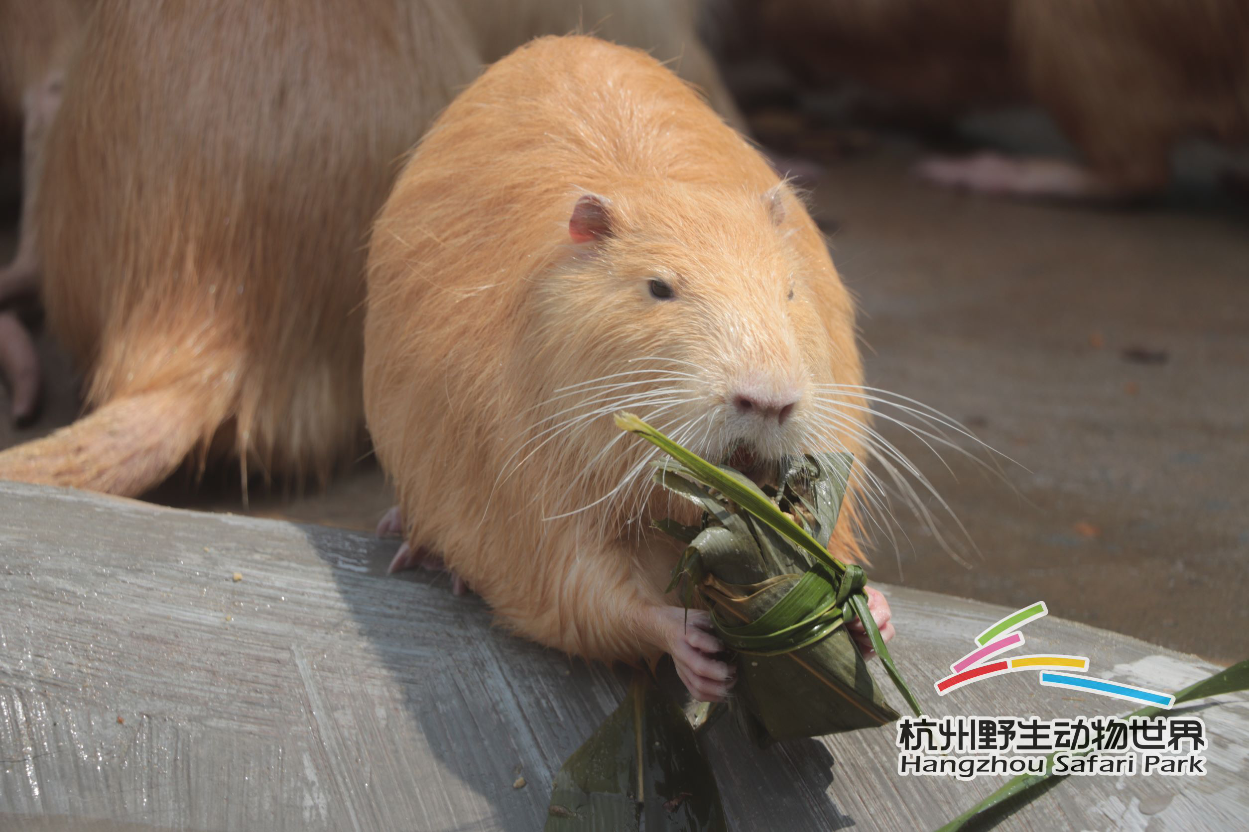 黄色海狸鼠吃上的是精料萝卜粽,作为刚入住杭野的新朋友,这也是它们在这庆祝的第一个传统节日。有的海狸鼠独自享受美食,有的则聚在一起,共同分享美味的粽子,金黄色的皮毛团团围住粽子,像极了一片金色麦浪在眼前涌动。