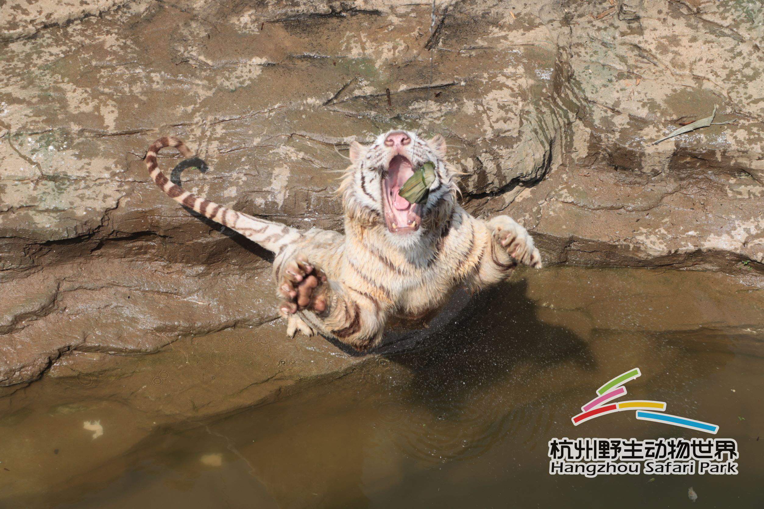 饲养员为白虎安排的是鲜鸡肉粽,新鲜的鸡胸肉由展区上方缓缓落下,等候多时的白虎们马上开启“饿虎扑食”模式,蓄力、跳跃、扑食、平稳落地,一连贯的操作轻松吃上肉粽,真不愧是百兽之王。