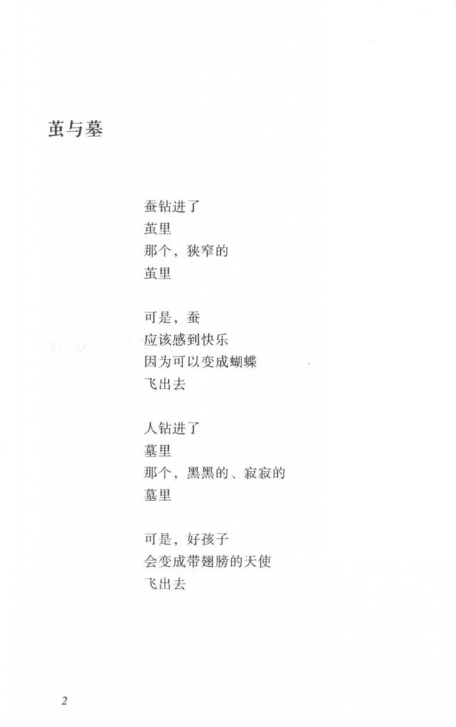 在《茧与墓》中,实际上喻示了生命的终结,是人生的悲哀,但是作者笔调一转,从这一个极黑暗的层面,产生了一种反弹的联想,就是死去的生命,化作了“带翅膀的天使”,超越死亡,从而牟取了金子美铃式的诗意。
