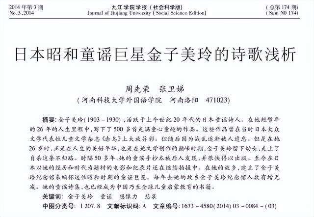 我们不妨找一段学者的论文。这是周先荣、张卫娣撰写的论文《日本昭和童谣巨星金子美玲的诗歌浅析》中的分析: